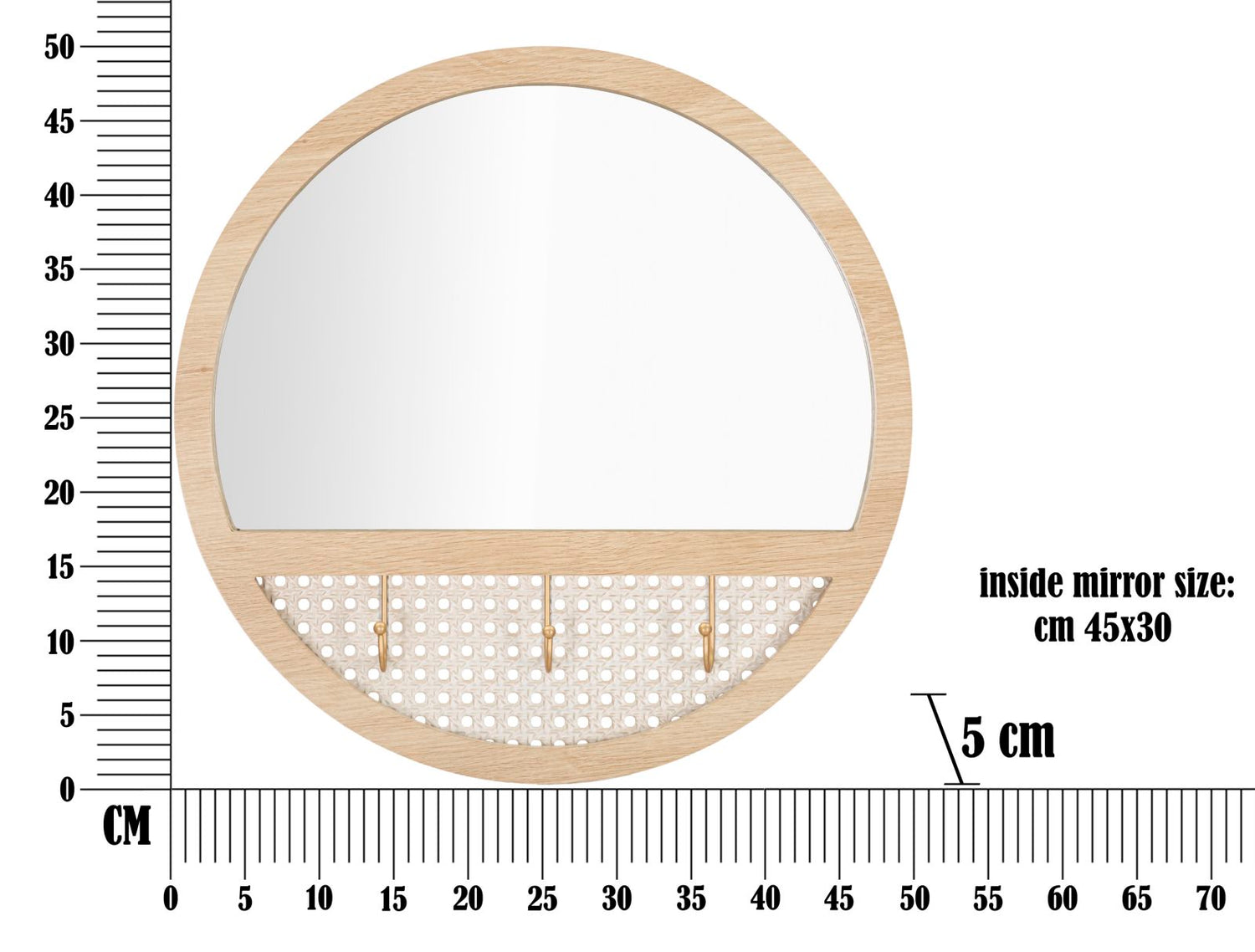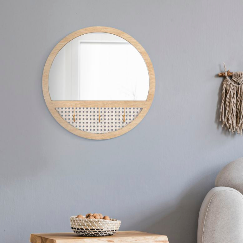 SPECCHIO FUJI - Specchio rotondo da parete completo di 3 appendini con una particolare lavorazione che richiama la paglia di Vienna. Linee semplici e cura nel design donano un tocco di unicità all'articolo.
