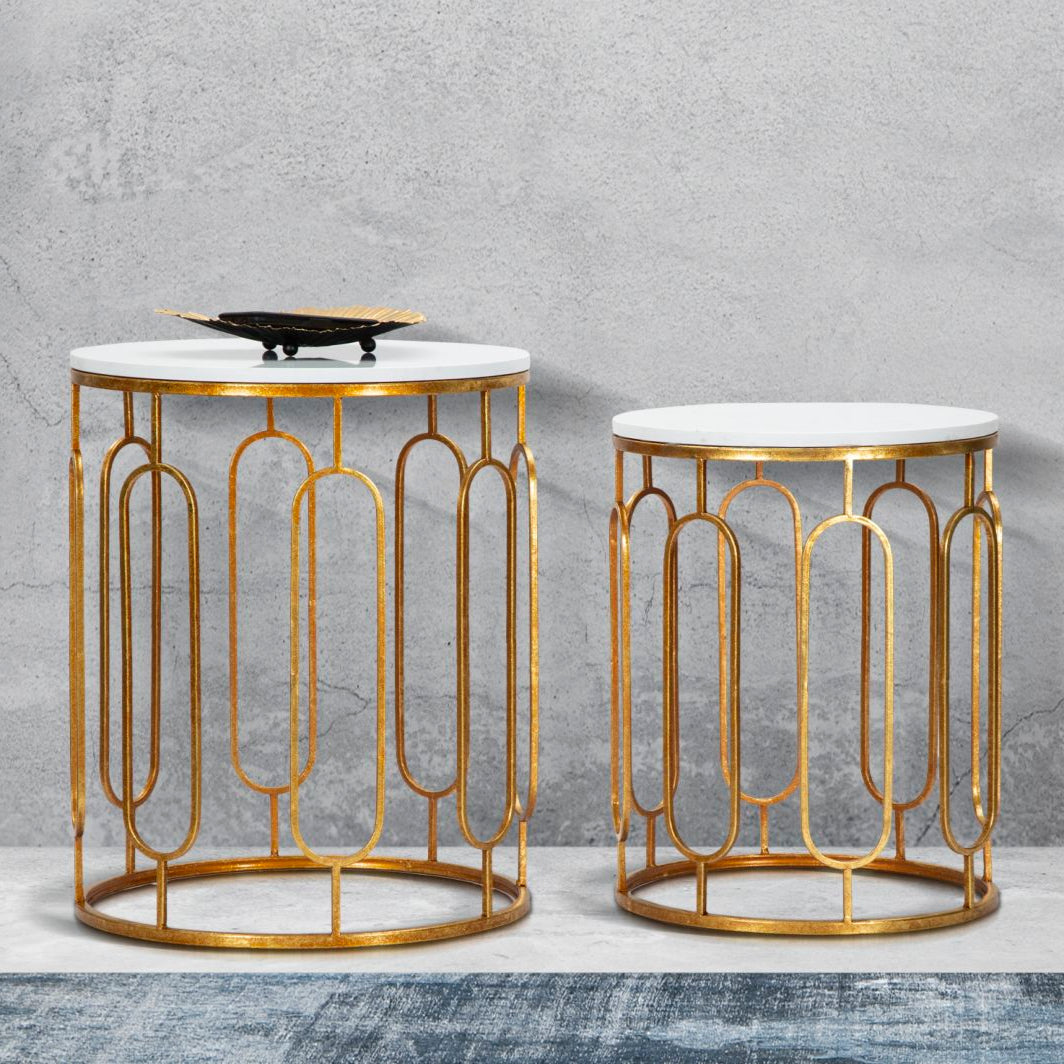 TAVOLINETTI TORY MARBLE COPPIA - Set di 2 tavolinetti rotondi in metallo dorato con piano in marmo bianco. Le linee elaborate della struttura in oro si fondono perfettamente con l'eleganza del marmo bianco per rendere speciale ogni living.