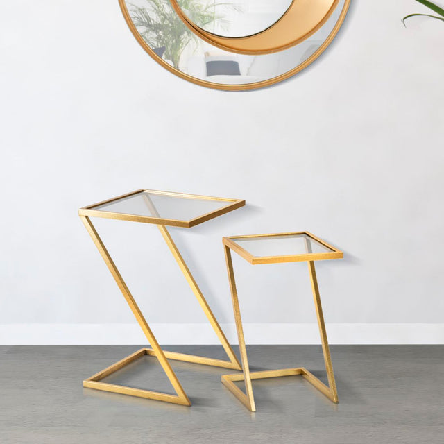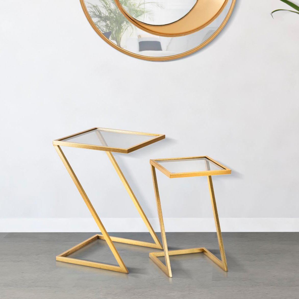 TAVOLINETTI Z COPPIA - Coppia di tavolinetti con struttura in metallo dorato e piano in vetro fumé, dalle linee geometriche ed essenziali.