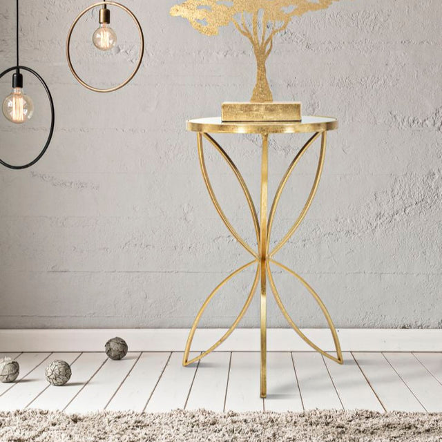 TAVOLINETTO BUTTERFLY - Elegante tavolinetto rotondo in metallo dorato con piano in vetro a specchio dalle linee morbide e sinuose. Il design che richiama le ali di una farfalla unito alla morbidezza delle linee creano un insieme unico che rende speciale ogni ambiente.