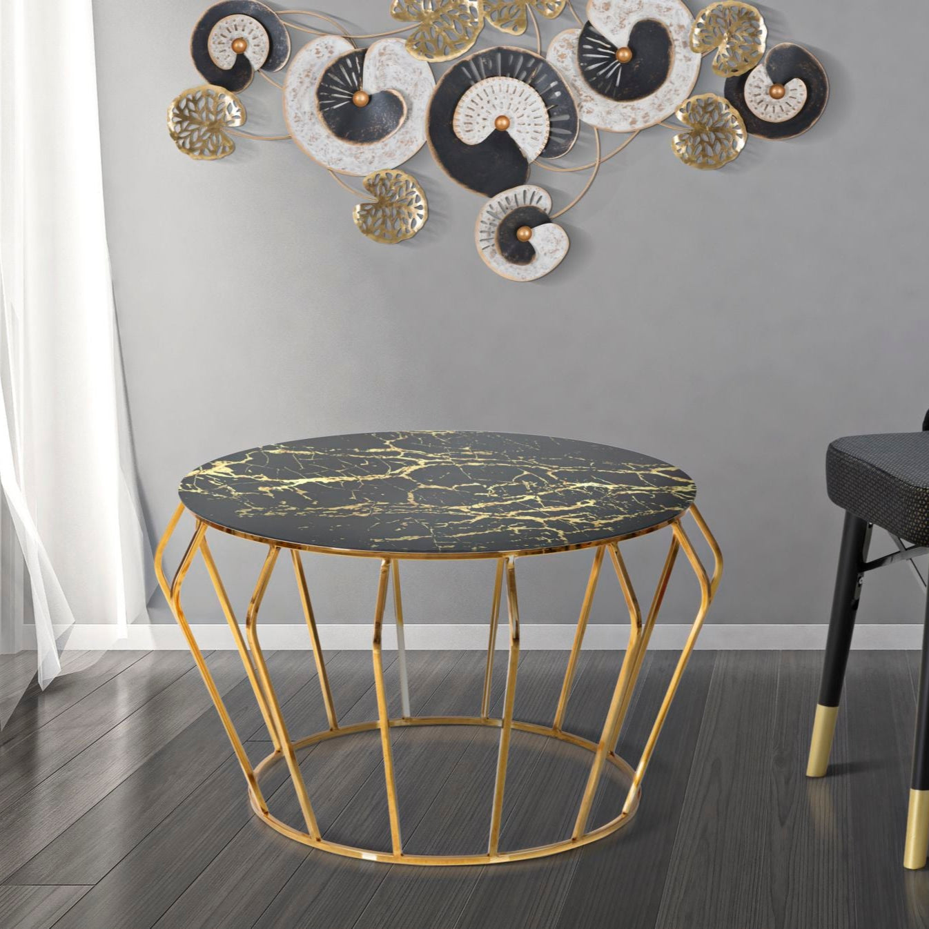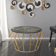 TAVOLINETTO DA CAFFE' HISTOR - Tavolo da caffè rotondo in metallo dorato con piano in vetro con lavorazione simil marmo. Il design lineare ed il contrasto tra l'oro e il nero creano un effetto elegante e particolarmente di classe.