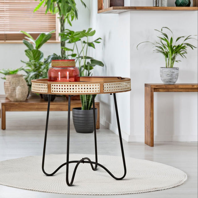 TAVOLINETTO FUJI - Tavolo basso con base in metallo nero e piano con bordo in legno decorato con paglia di Vienna. La particolare combinazione dei materiali lo rendono un perfetto mix da abbinare ad ogni tipologia di arredo.