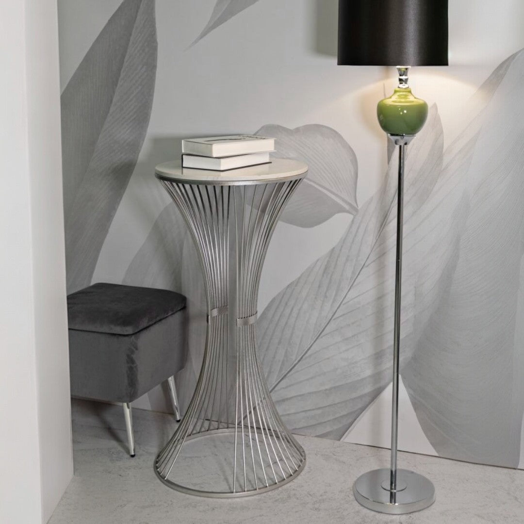 TAVOLINETTO FUNNEL - Tavolinetto in metallo argentato con base a linee intrecciate, che si uniscono con eleganza. Il top in marmo, con le sue venature naturali, aggiunge un tocco di raffinatezza.