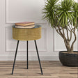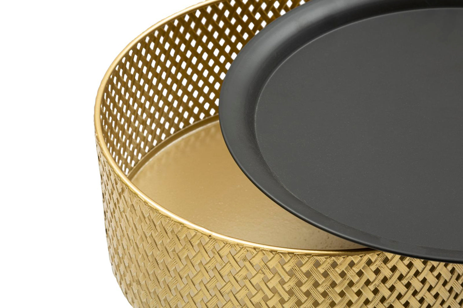 TAVOLINETTO GLOVY - Tavolinetto rotondo in metallo dorato con piano nero. La parte superiore è finemente decorata con intrecci per donare un tocco di eleganza. Il top è removibile, all'interno è presente un pratico contenitore.