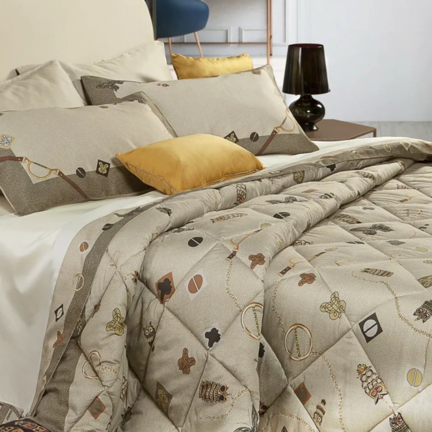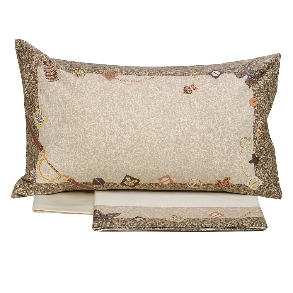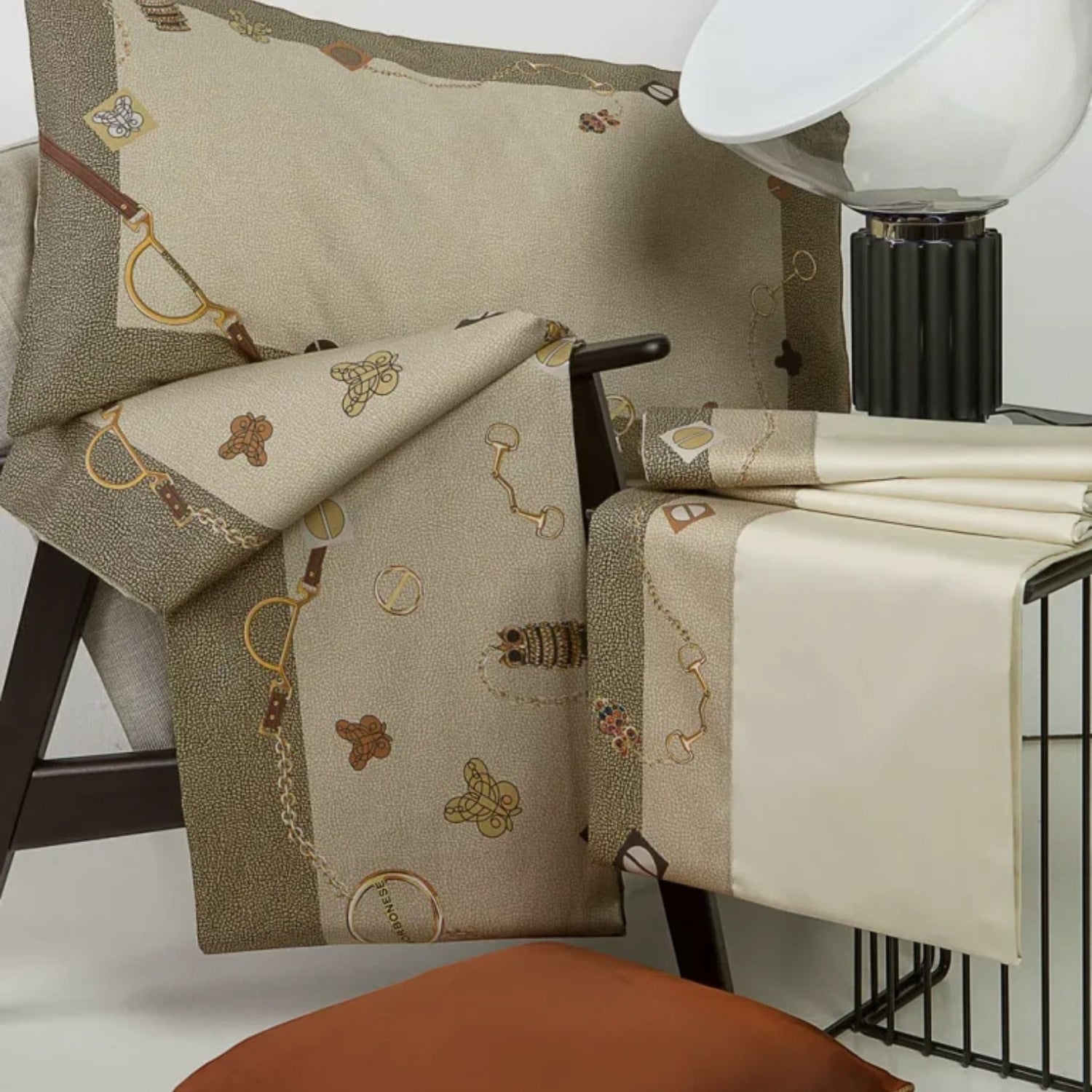 Completo lenzuola in raso di puro cotone 300 T.C. Il lenzuolo è in tinta unita; il bordo applicato e le federe sono stampate con design personalizzato dall’iconica texture “OP” Occhio di Pernice; il sotto con angoli è in raso tinta unita. Vesti di eleganza la tua casa, con l’esperienza di Tessitura Randi e il design iconico Borbonese.