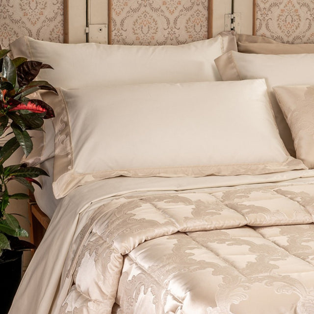 Completo letto in puro cotone con bordo lenzuolo e federe a tre lati in tessuto jacquard, piattina in raso cotone. Realizzato artigianalmente e 100% Made in Italy.
