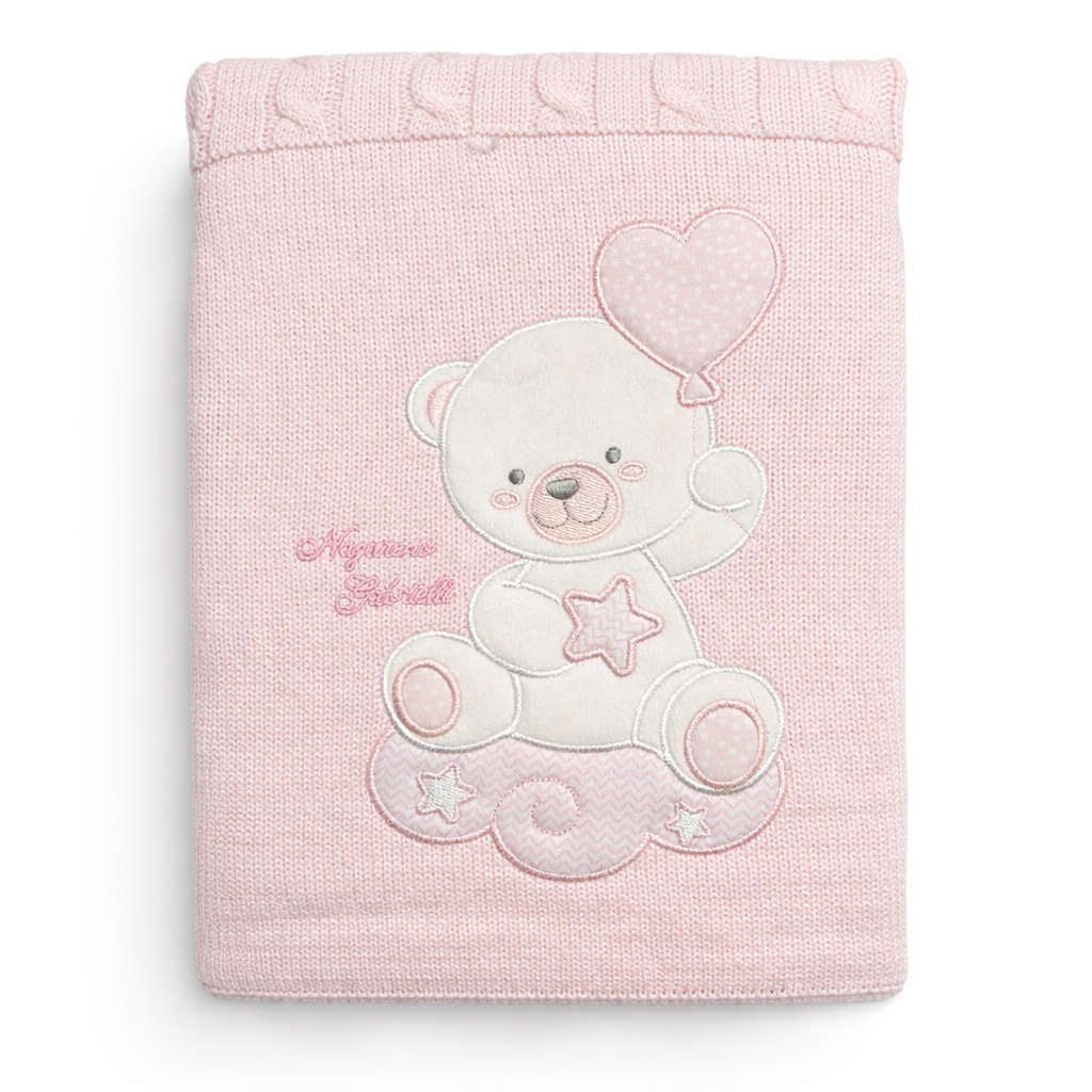 Realizzata in morbida maglia, presenta un tenero ricamo con orsetto e dettagli raffinati che rendono la copertina non solo funzionale ma anche decorativa. La lavorazione superiore con motivo intrecciato dona un tocco elegante e curato, perfetto per completare il corredino nascita.