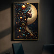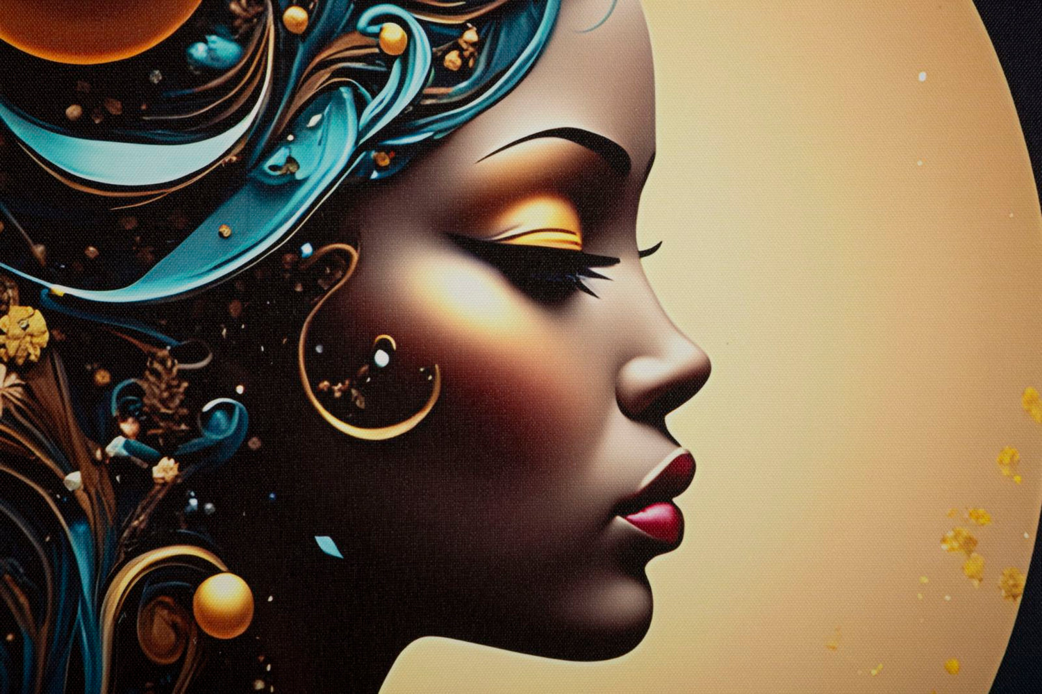 Un profilo femminile avvolto da bagliori dorati e dettagli LED che amplificano il suo fascino cosmico. Un quadro che celebra forza, saggezza e bellezza luminosa.