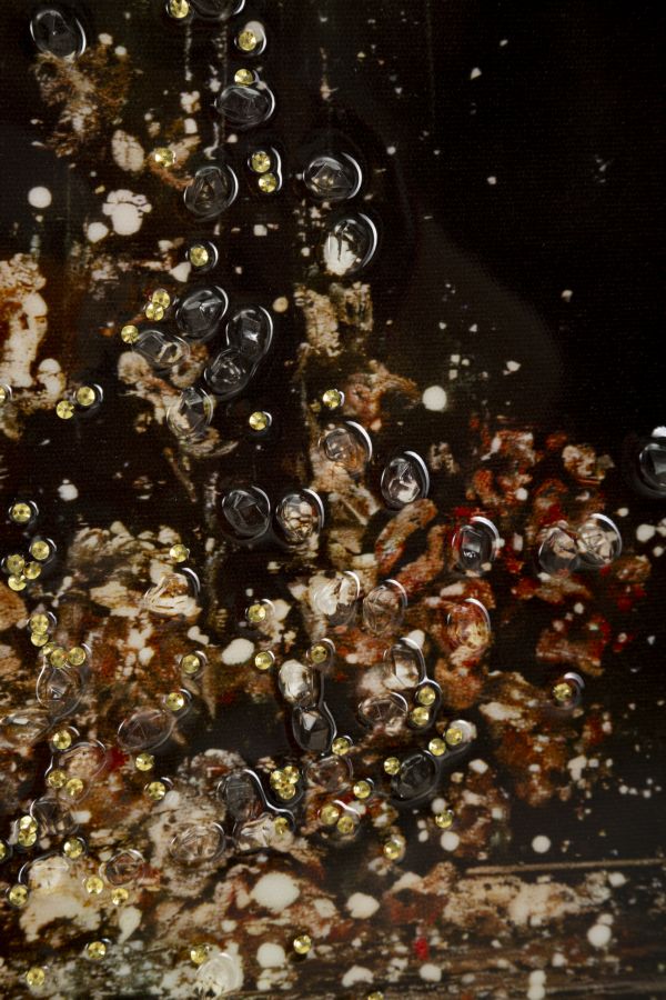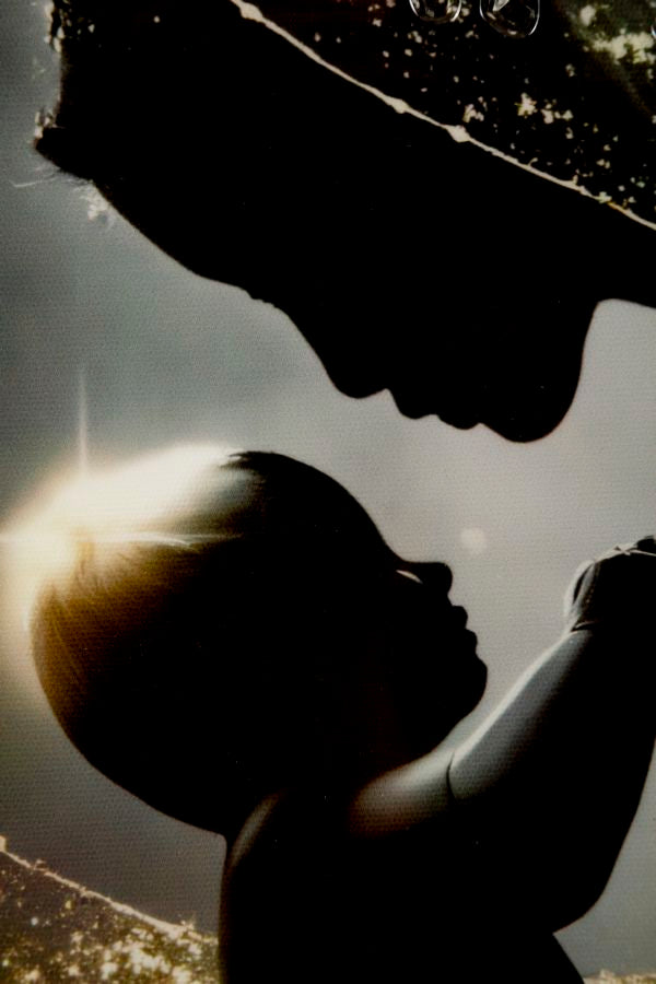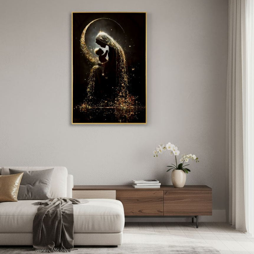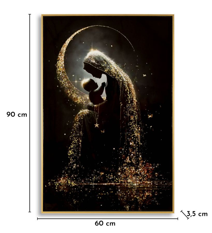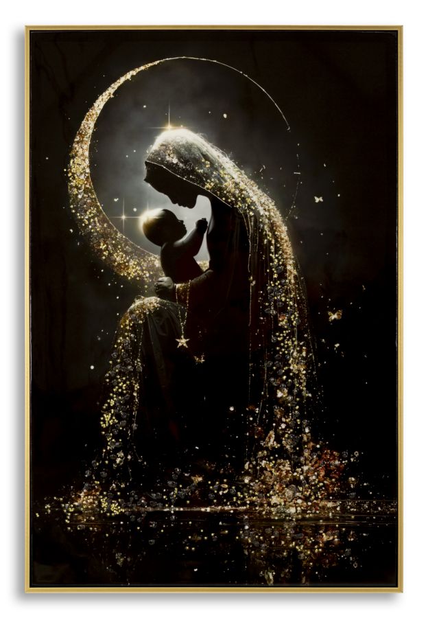 Un abbraccio materno reso magico da cascate di luce dorata. Un’opera che trasmette amore, protezione e un profondo senso di intimità.