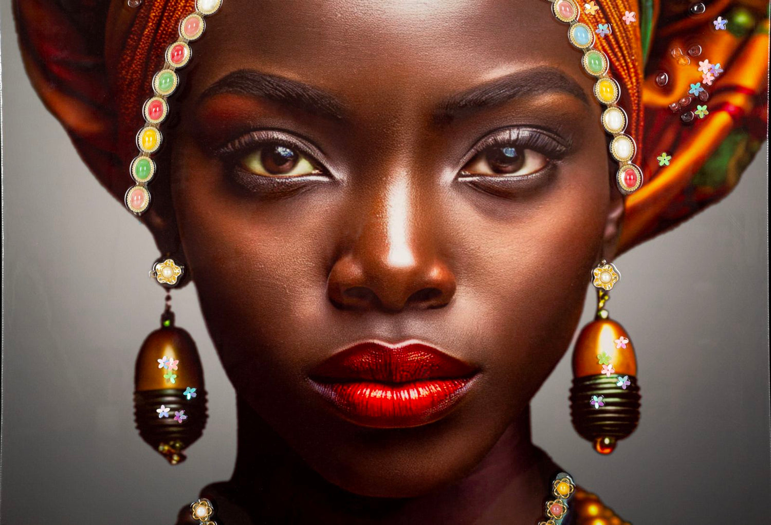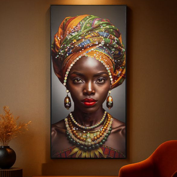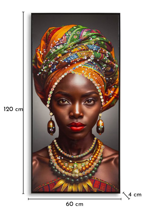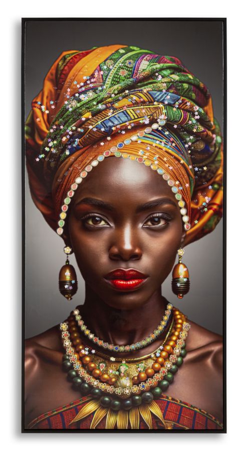 Un ritratto femminile dal forte impatto visivo, con turbante dai colori caldi e dettagli preziosi. Un’opera che celebra la bellezza fiera e la potenza dei colori etnici.