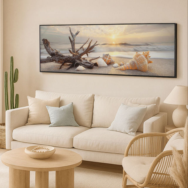 Conchiglie e legni levigati dal mare illuminati da una luce soffusa: un quadro che evoca ricordi d’estate e momenti di pace in riva al mare.