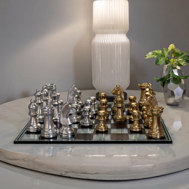 Elegante e scenografico, il Set Scacchiera Nera/Bianca fonde strategia e stile. Le pedine dorate e argentate su base specchiata trasformano ogni partita in un’esperienza di classe, dove ogni mossa è un gesto di design.