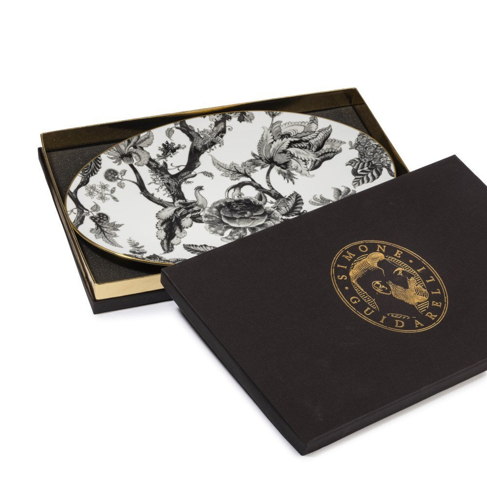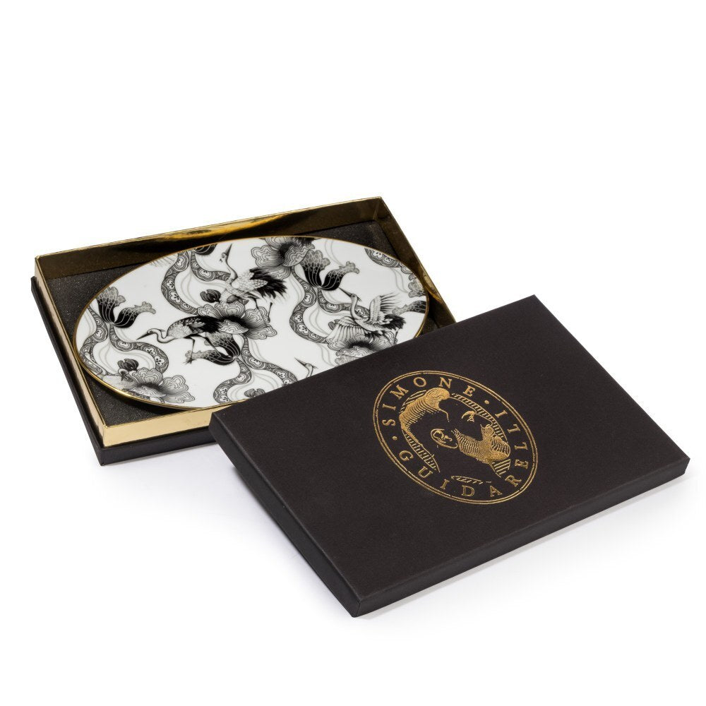La collezione di piatti e accessori in porcellana Souvenirs de Voyage si presenta all’interno di un’elegante scatola regalo imbottita e rifinita con bordura, logo di Simone Guidarelli e dettagli stampati in oro.
