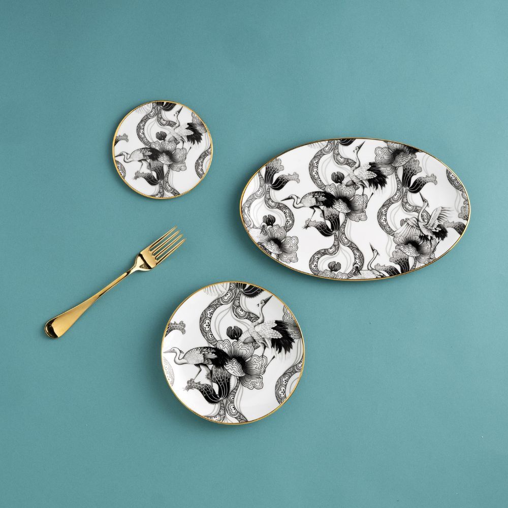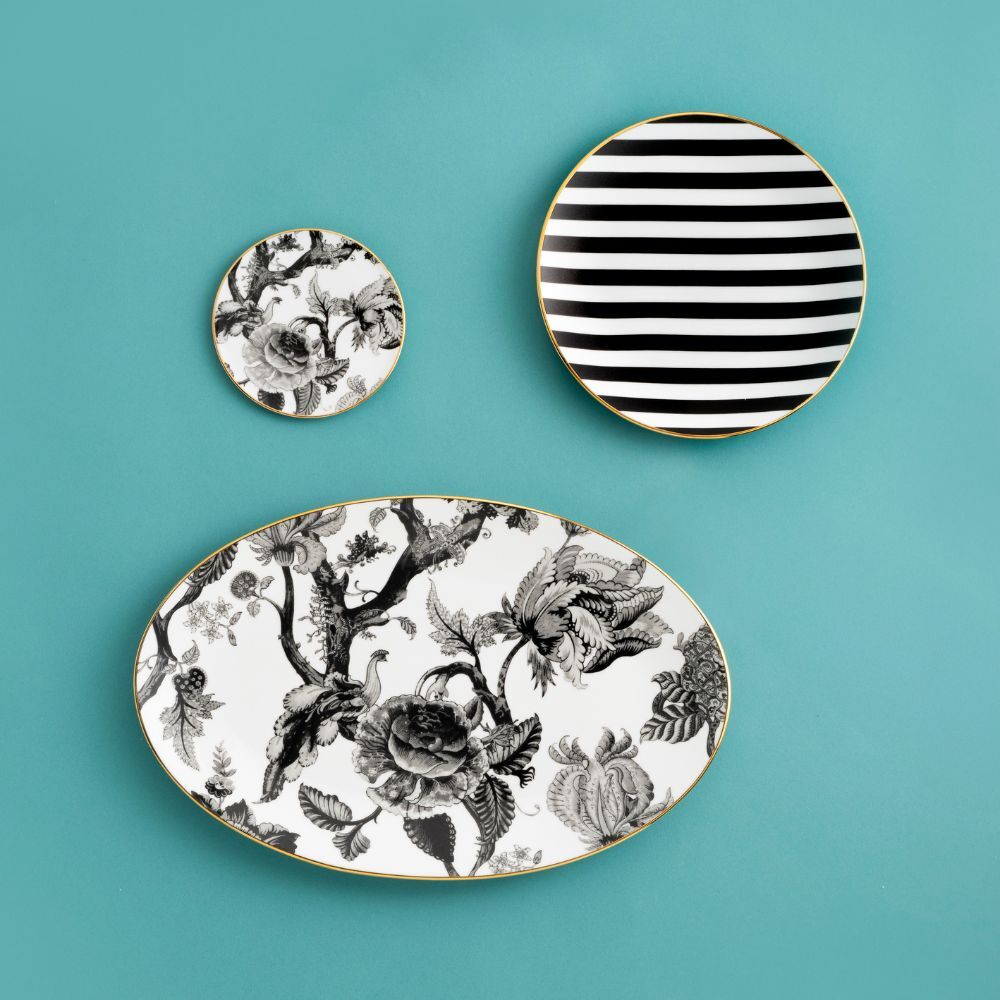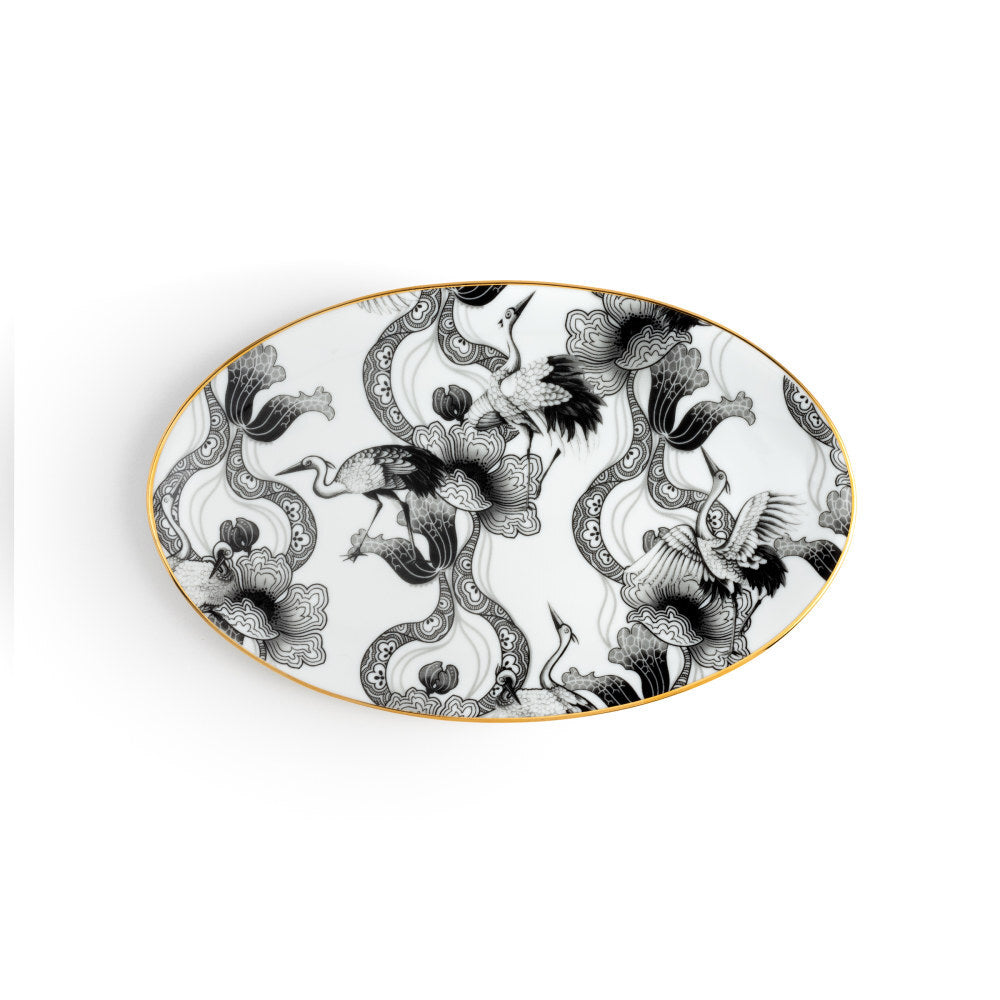 Vassoi ovali da portata in porcellana rifiniti a mano con filo in vero oro.
