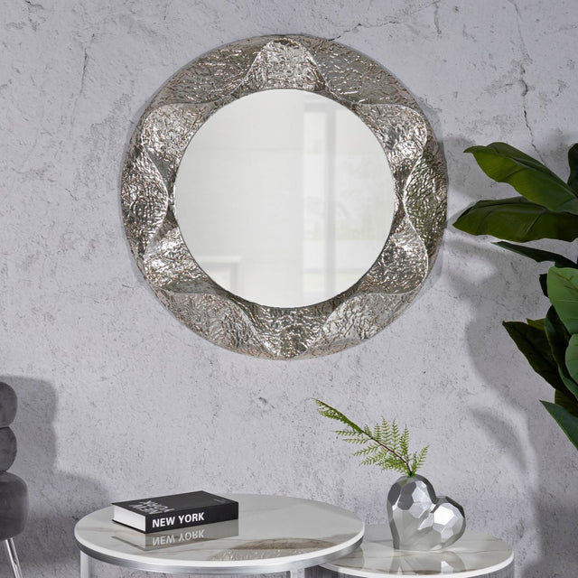 Specchio rotondo con ampia cornice decorativa in finitura metallica martellata. Uno stile sofisticato che valorizza ambienti moderni, classici o glam. Perfetto come punto luce su una parete importante.