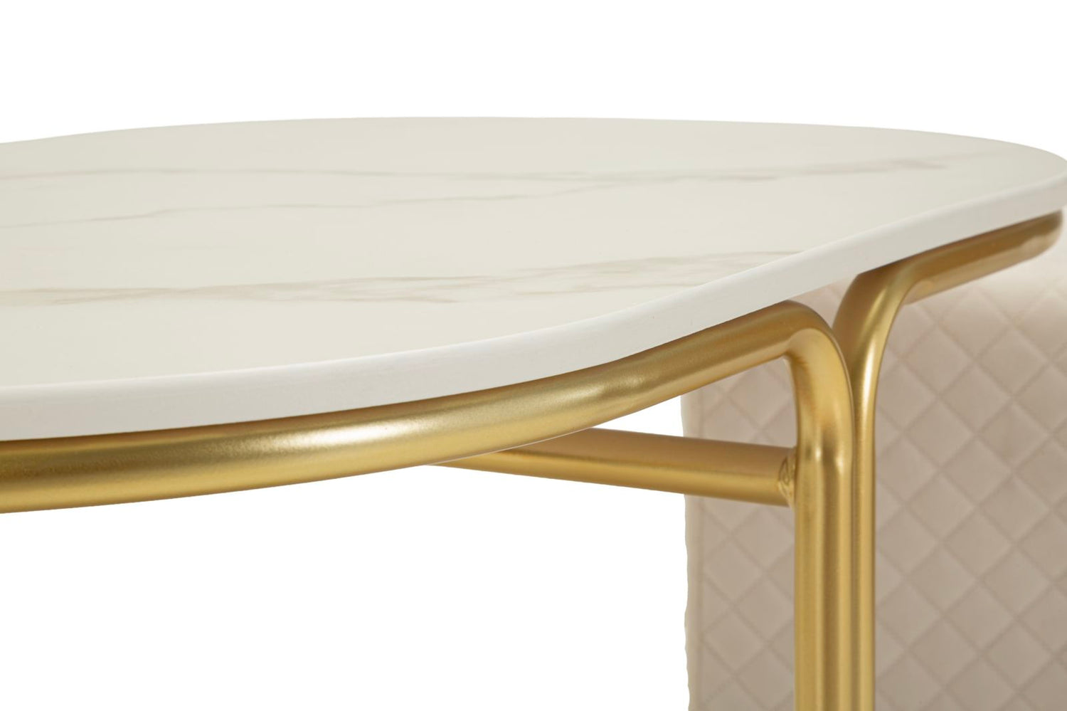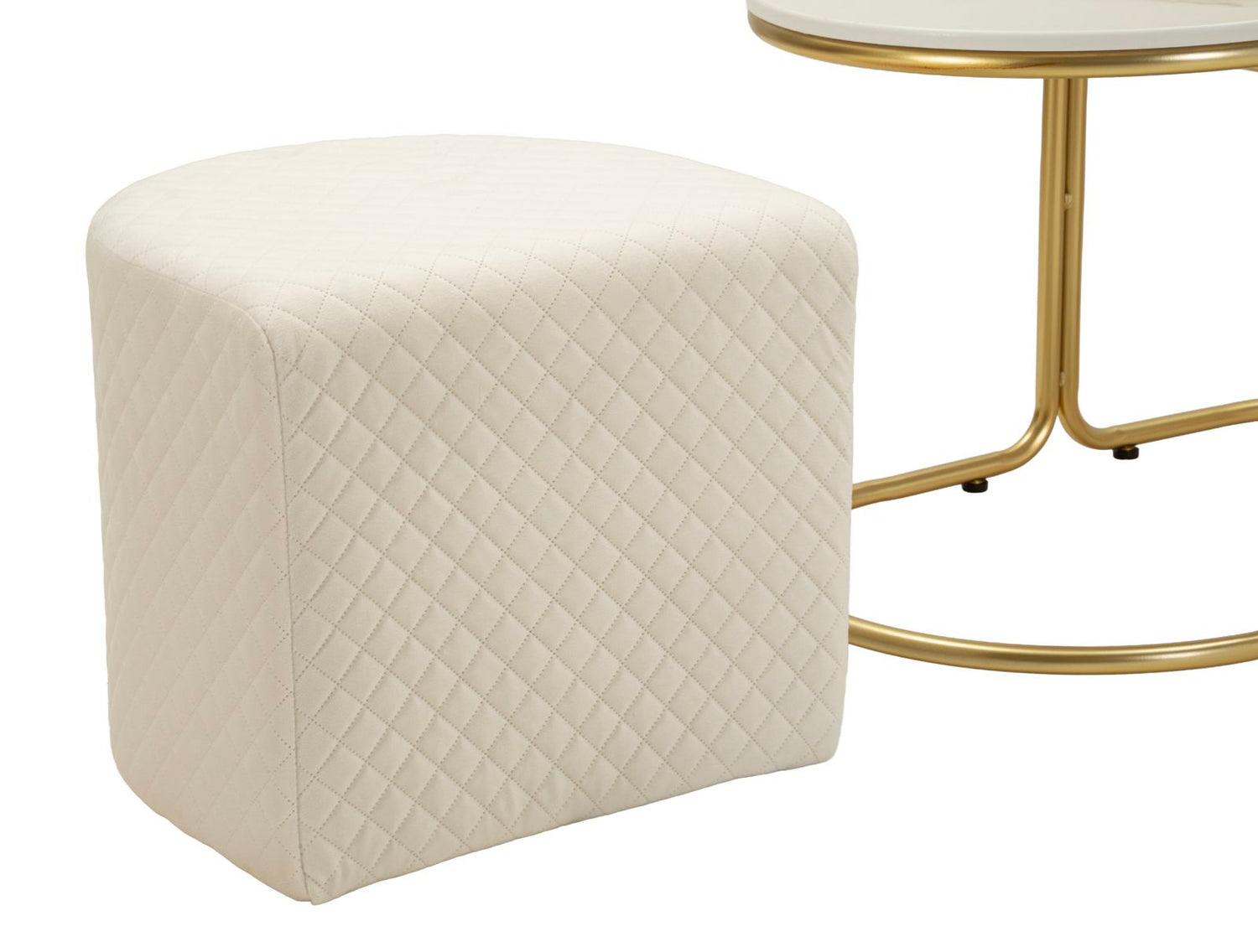Un set versatile e armonioso che abbina linee morbide e dettagli dorati. I due puff si integrano sotto il piano in un equilibrio di comfort e design moderno.