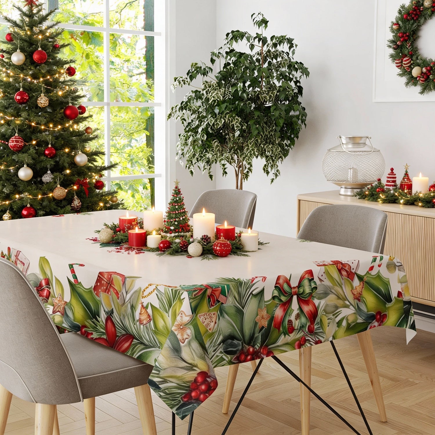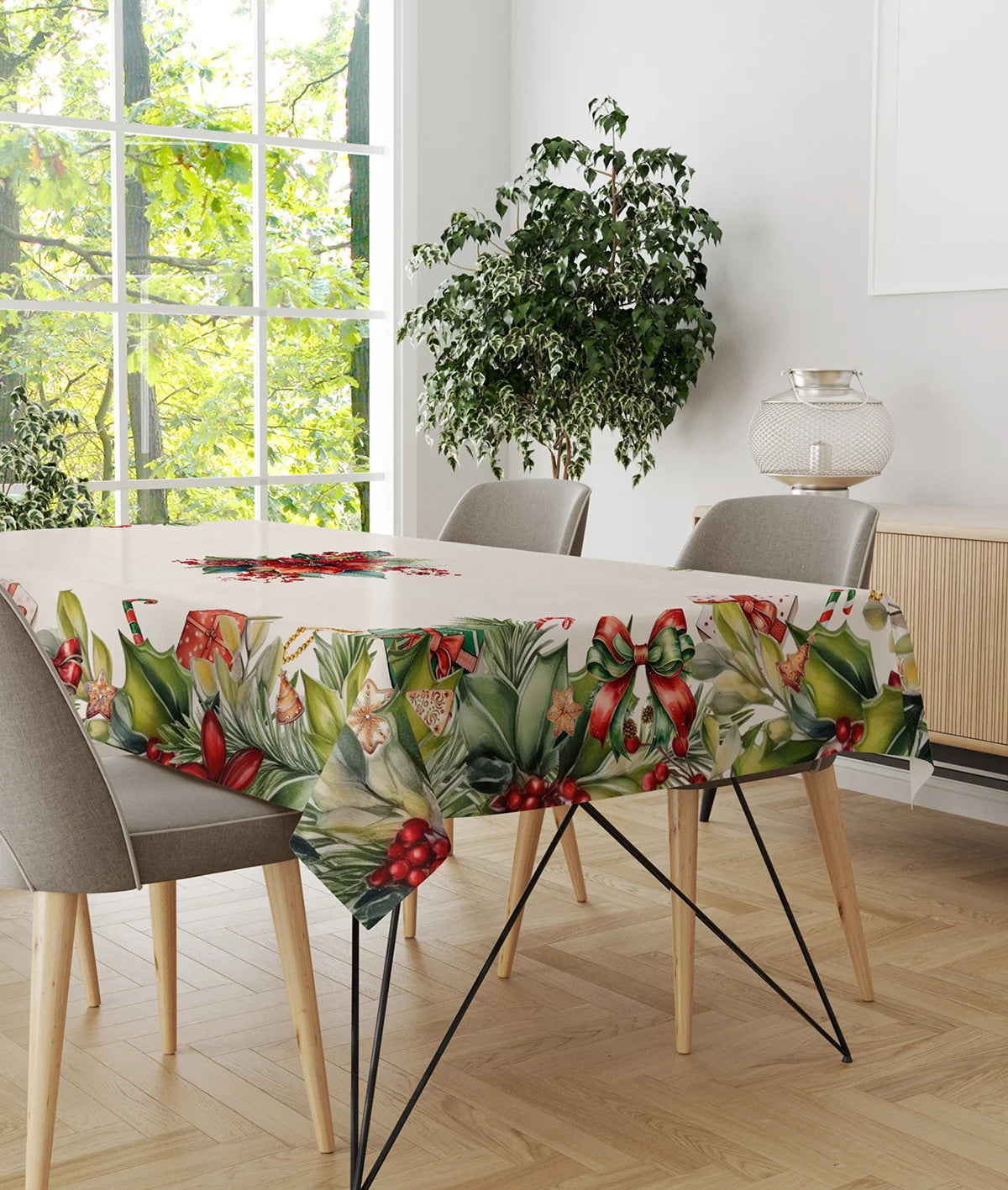La tovaglia natalizia è caratterizzata da eleganti motivi a tema festivo e realizzata in tessuto 100% cotone di alta qualità. La stampa digitale valorizza i colori e i dettagli, rendendo ogni tavola calda e accogliente durante le festività.