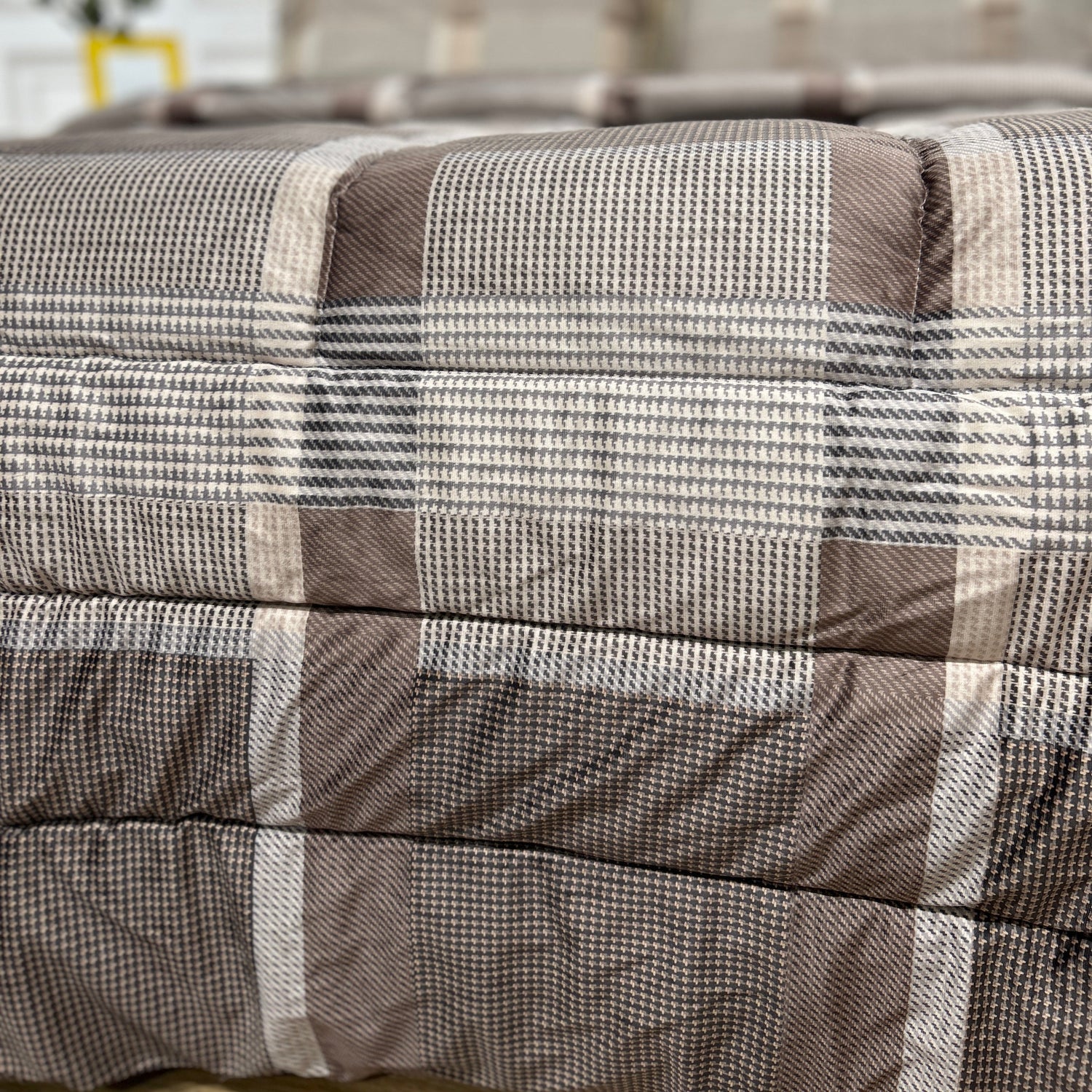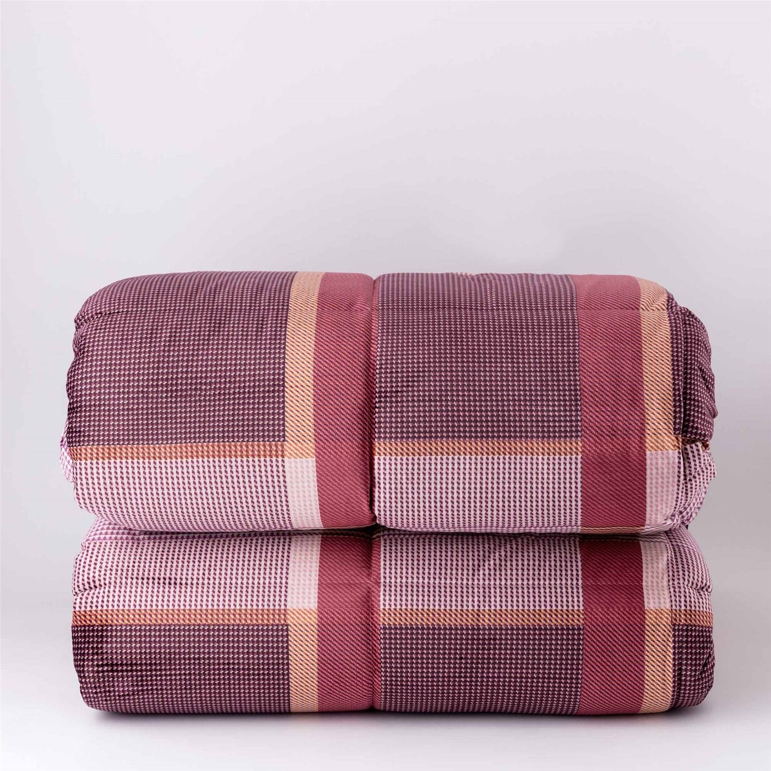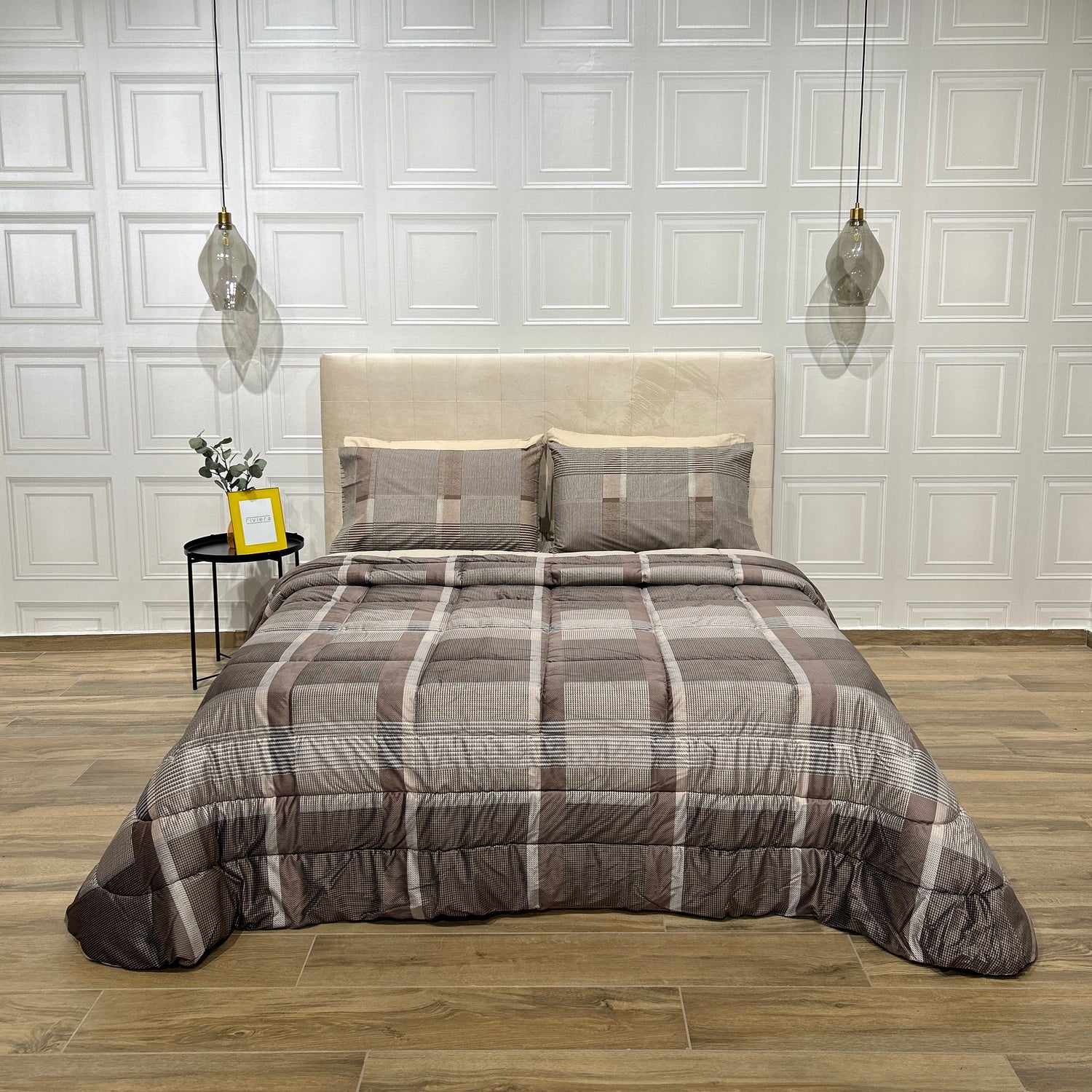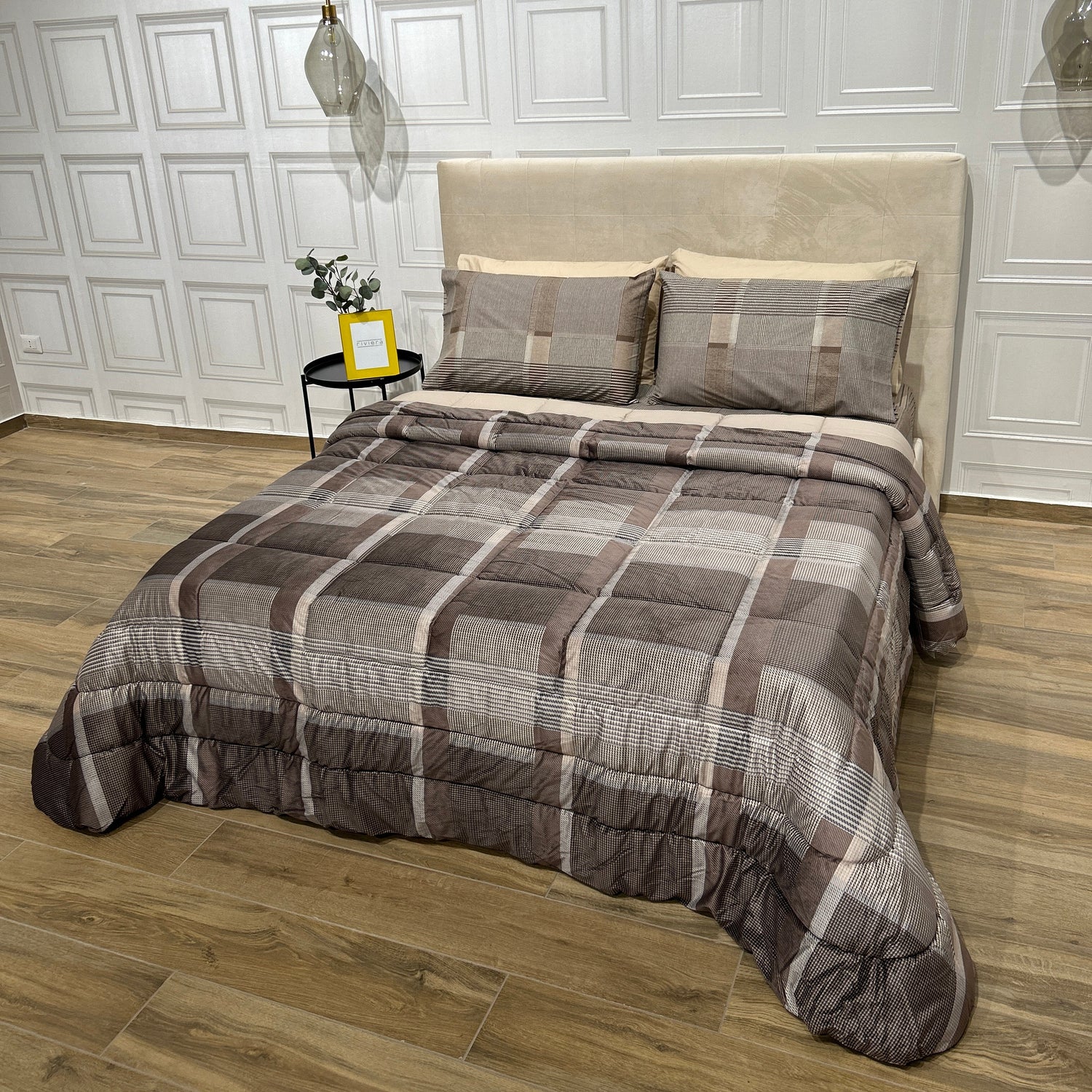 Imbottitura 100% poliestere 350 gr/m2, trapuntatura piazzata a quadri, 3 cornici e chiusura con angoli tondi.