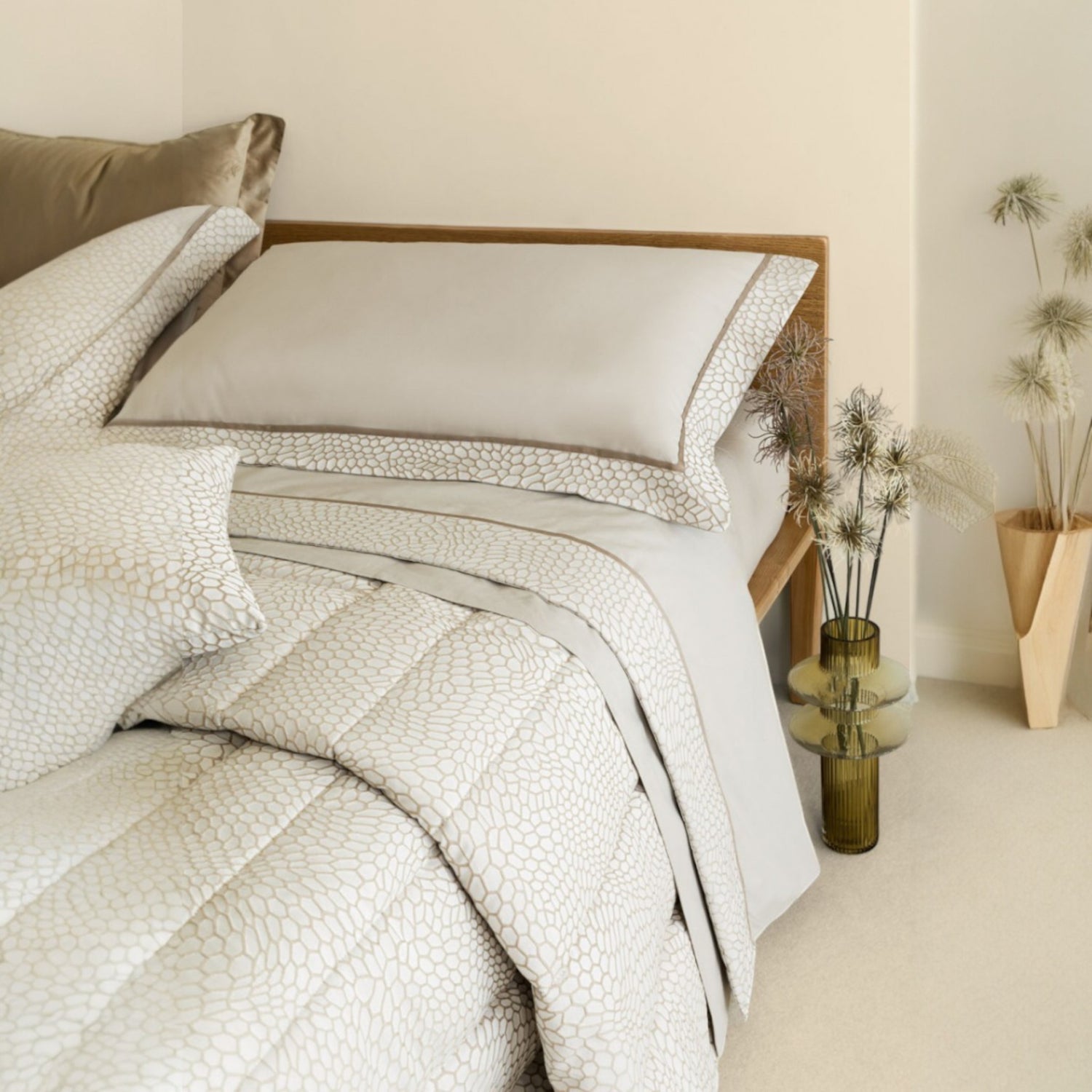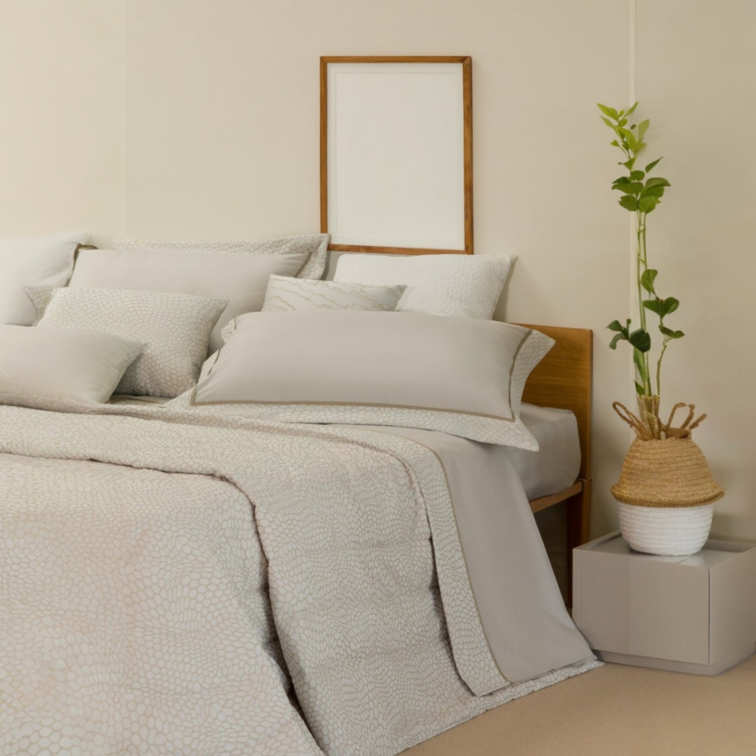 Completo letto in puro cotone con bordo lenzuolo e federe a tre lati in tessuto jacquard, piattina in raso cotone. Realizzato artigianalmente e 100% Made in Italy.