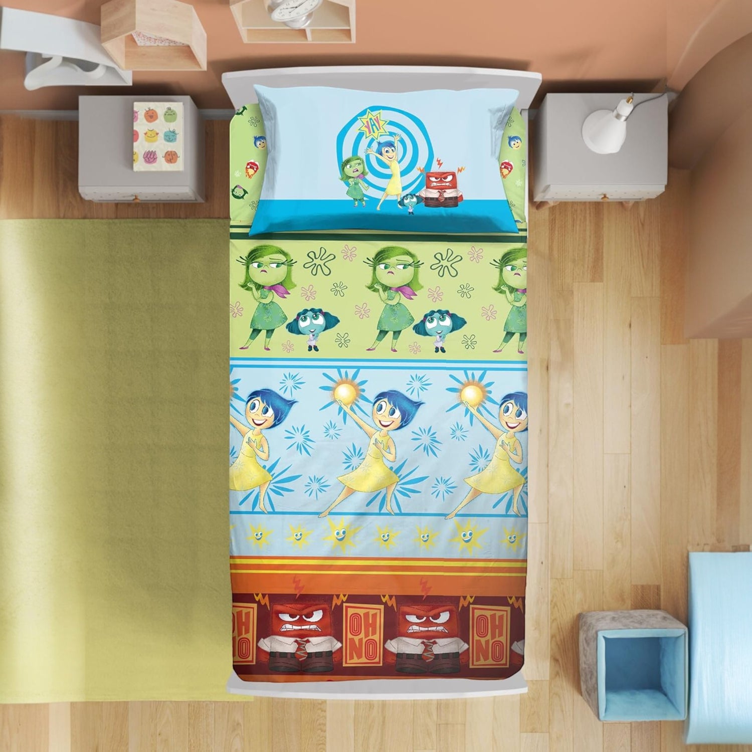 Completo lenzuola singolo dedicato a Inside Out, perfetto per portare colore ed emozioni nella cameretta dei più piccoli. Realizzato in 100% cotone, è morbido, traspirante e confortevole, ideale per il riposo quotidiano. La stampa originale con i personaggi del film rende il letto allegro e accogliente.