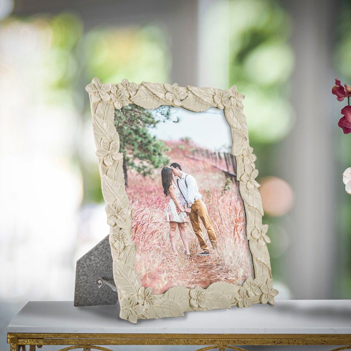 Elegante portafoto con cornice decorata da foglie e fiori. Formato foto cm 20x25.