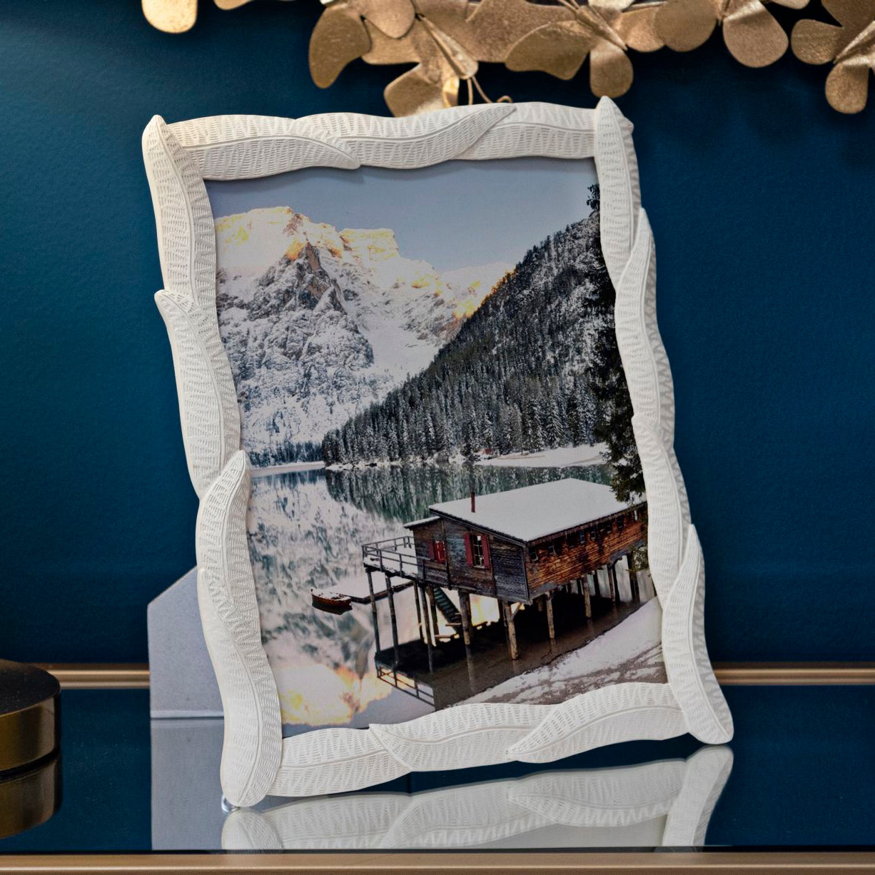 Cornice rettangolare da appoggio in resina realizzata con intrecci di foglie. Può essere posizionata sia in orizzontale che in verticale. Formato foto cm 20x25.