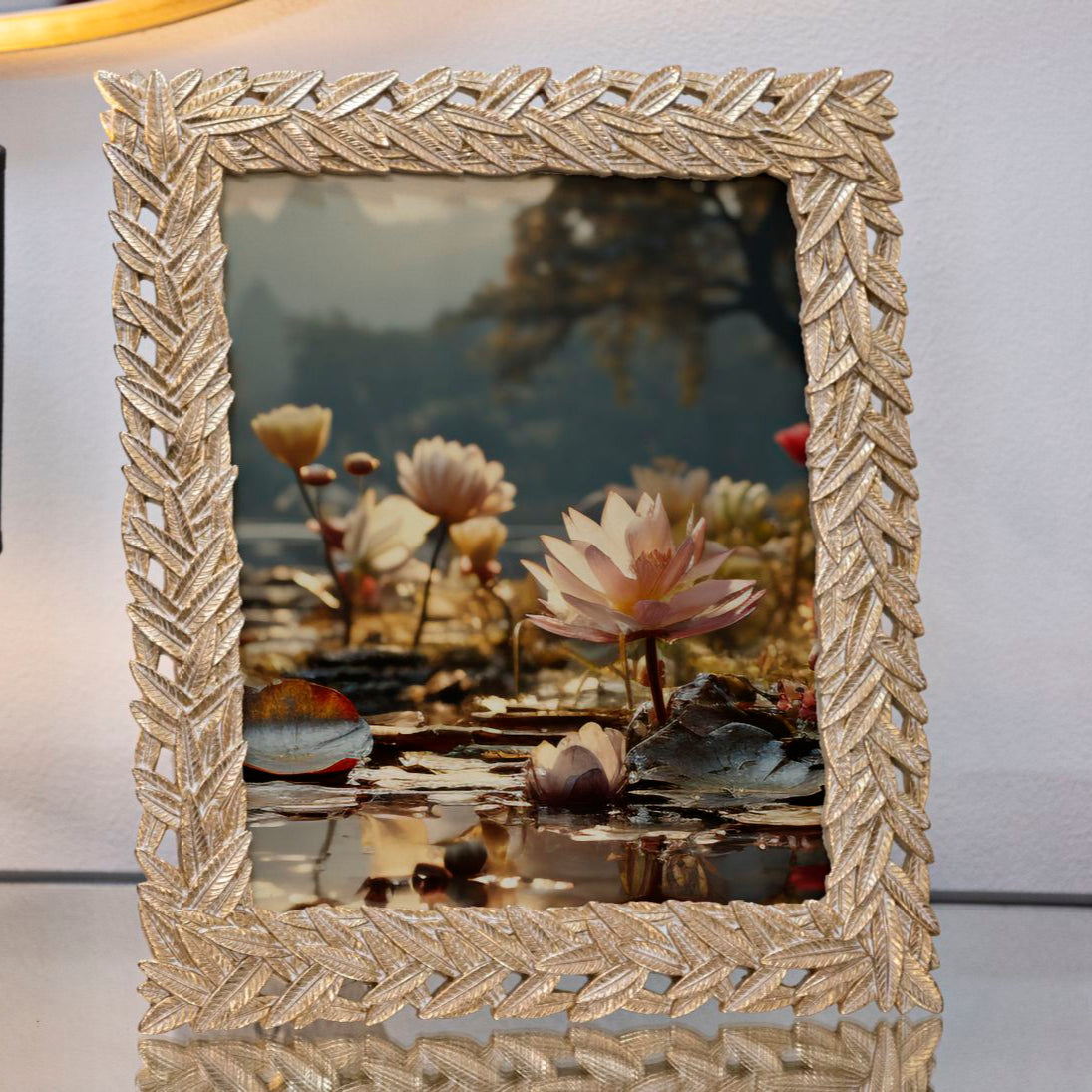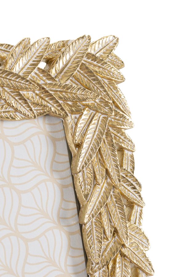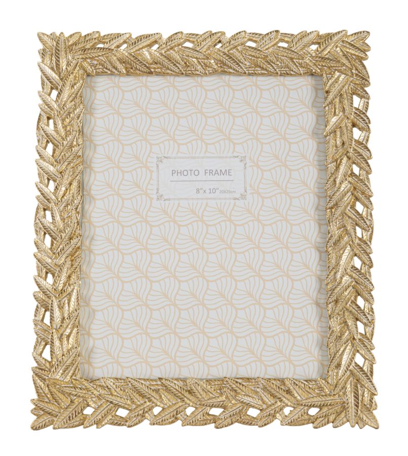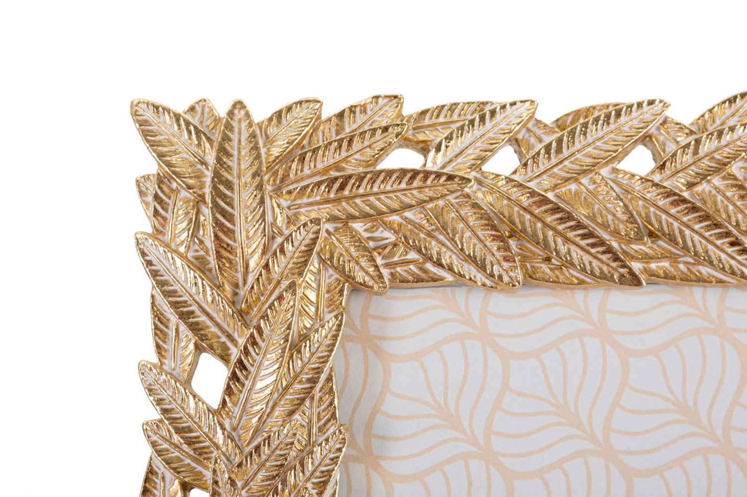 Cornice rettangolare da appoggio in resina dal design composto da un intreccio di foglie. Può essere posizionata sia in orizzontale che in verticale. Formato foto cm 20x25.