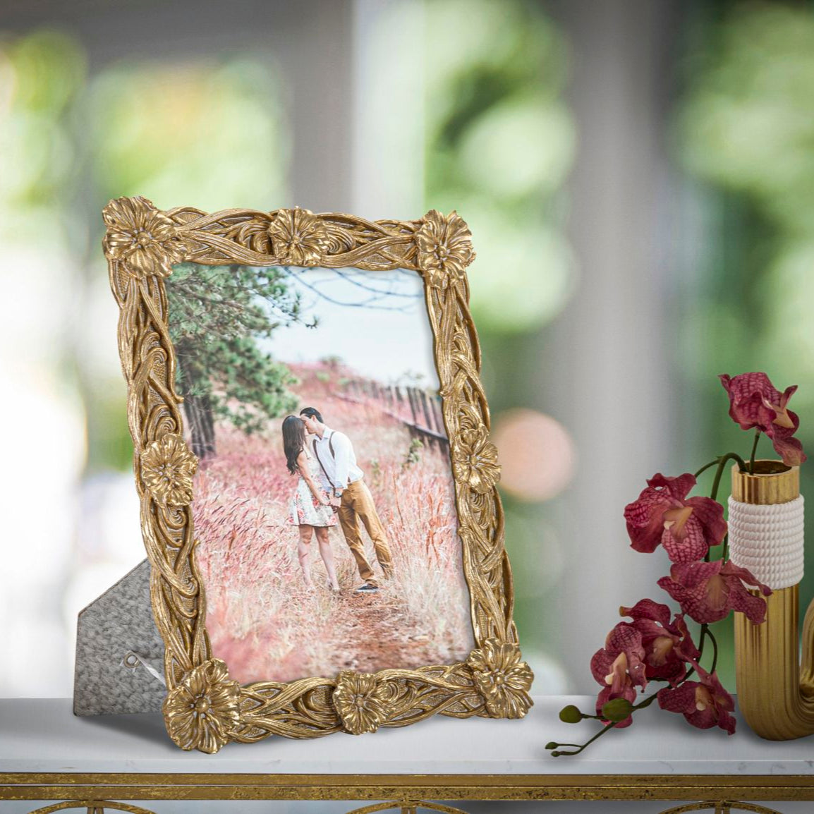 Elegante portafoto con cornice decorata da intrecci e fiori. Formato foto cm 20x25.