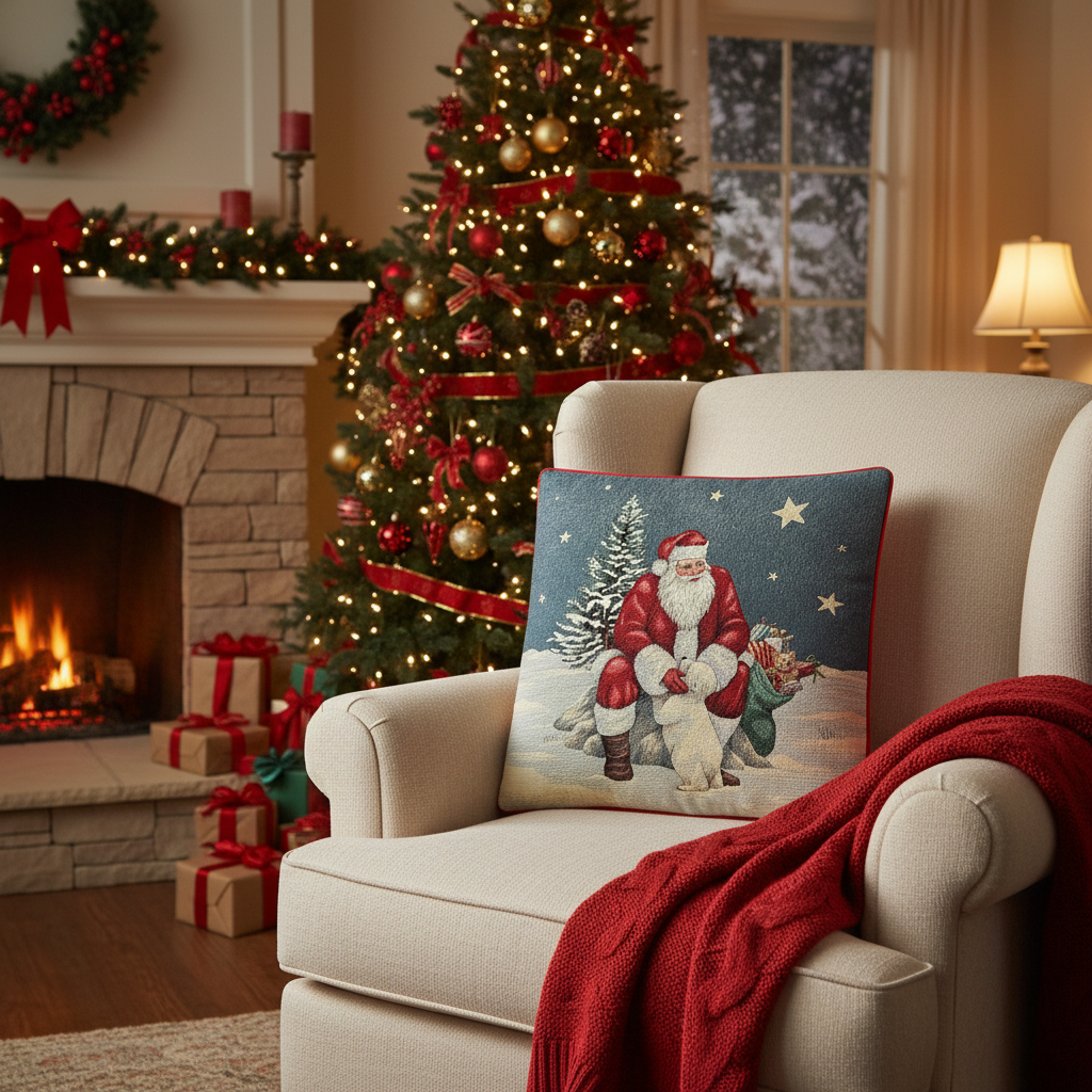 Decora la tua casa con il cuscino natalizio Karì, realizzato in pregiato tessuto Gobelin con filato Lurex che dona un tocco luminoso e festivo. Sfoderabile con zip, è completo di imbottitura in morbida fibra anallergica per il massimo comfort.