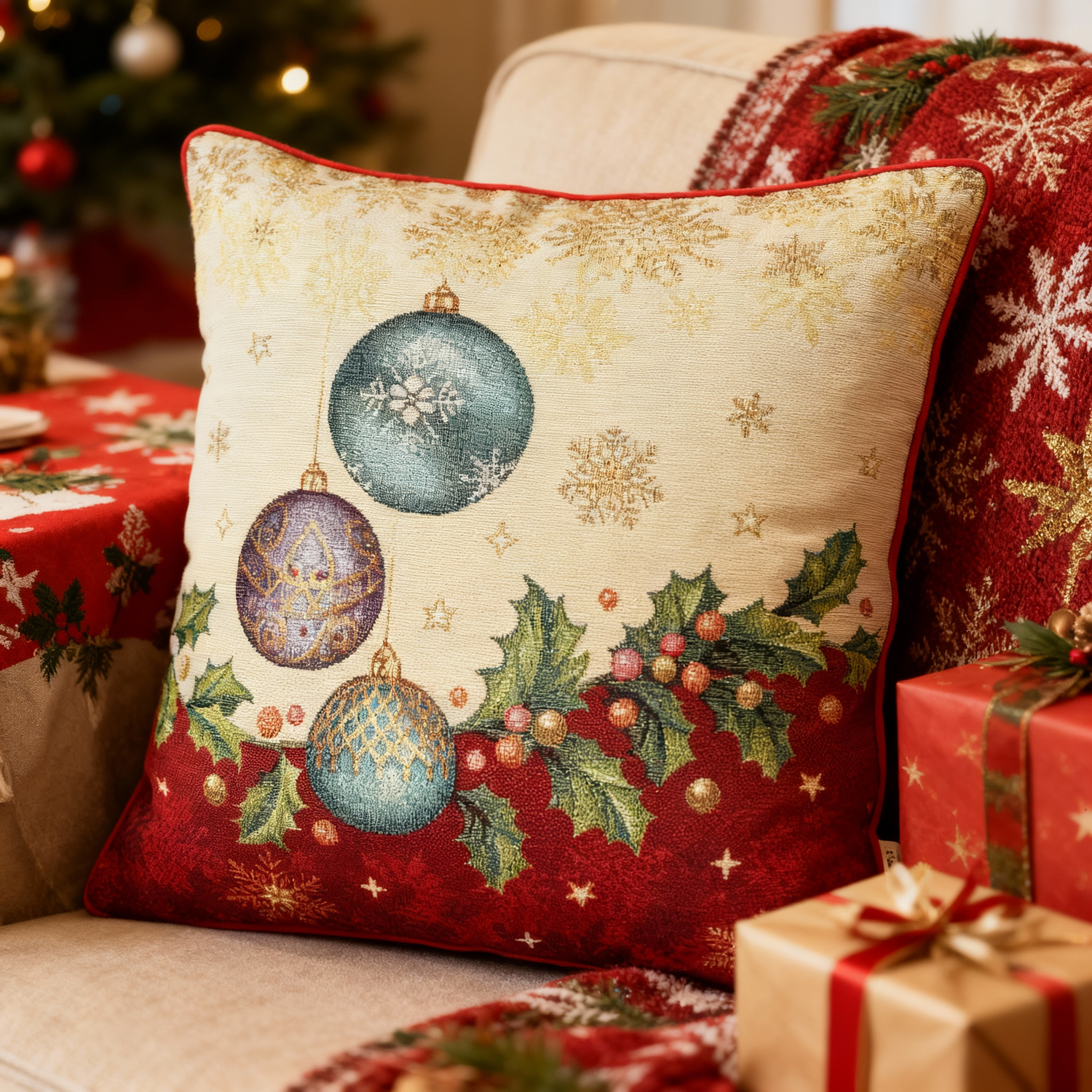 Decora la tua casa con il cuscino natalizio Karì, realizzato in pregiato tessuto Gobelin con filato Lurex che dona un tocco luminoso e festivo. Sfoderabile con zip, è completo di imbottitura in morbida fibra anallergica per il massimo comfort.