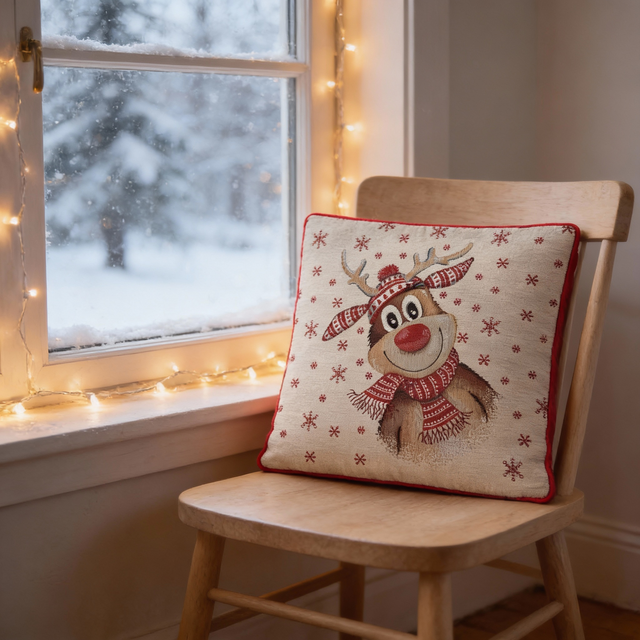 Decora la tua casa con il cuscino natalizio Karì, realizzato in pregiato tessuto Gobelin con filato Lurex che dona un tocco luminoso e festivo. Sfoderabile con zip, è completo di imbottitura in morbida fibra anallergica per il massimo comfort.