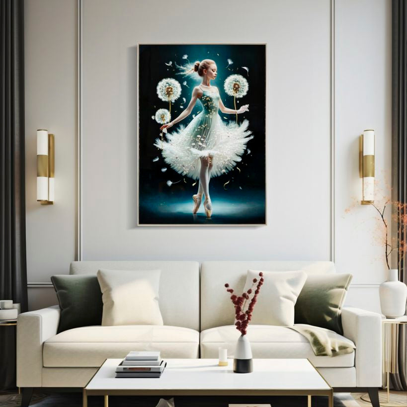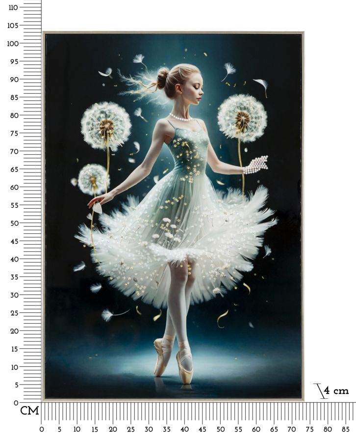 Dipinto su tela laccato con cornice Dancing esprime grazia e leggerezza con un tocco di magia. La ballerina eterea, avvolta in un abito che ricorda soffici piume, danza tra soffioni fluttuanti, evocando libertà e sogno. Perfetto per ambienti eleganti e raffinati.