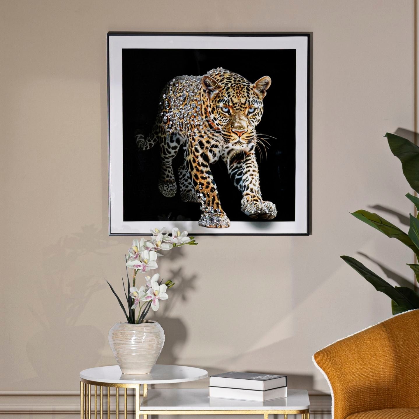 Un’opera dallo stile grintoso ed elegante, perfetta per chi vuole dare carattere e originalità ai propri ambienti. Raffigura un leopardo in primo piano su sfondo nero, reso ancora più scenografico dall’applicazione di strass luminosi che donano riflessi preziosi e tridimensionalità. Ideale per soggiorni, ingressi, uffici o ambienti moderni, aggiunge un tocco di lusso e dinamismo alla parete.