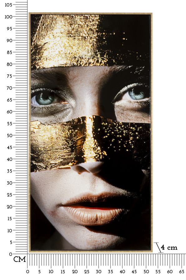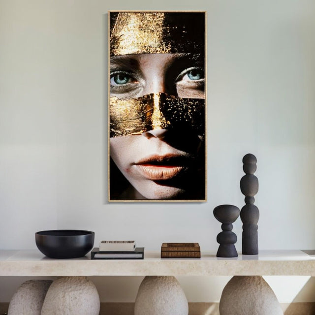 Un’opera moderna e di grande impatto visivo, capace di trasformare qualsiasi ambiente in un luogo elegante e sofisticato. La tela ritrae un volto enigmatico, impreziosito da fasce dorate luminose che esaltano l’intensità degli occhi chiari. I dettagli materici e i riflessi oro donano profondità e carattere, rendendo questo quadro ideale per soggiorni, uffici, ingressi e spazi contemporanei.