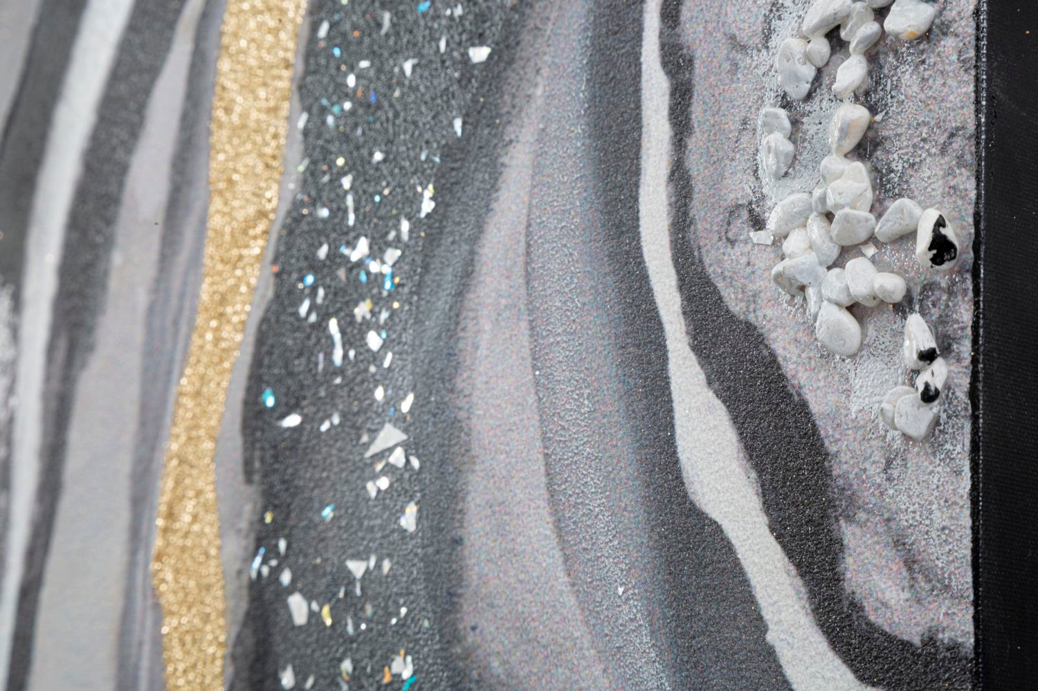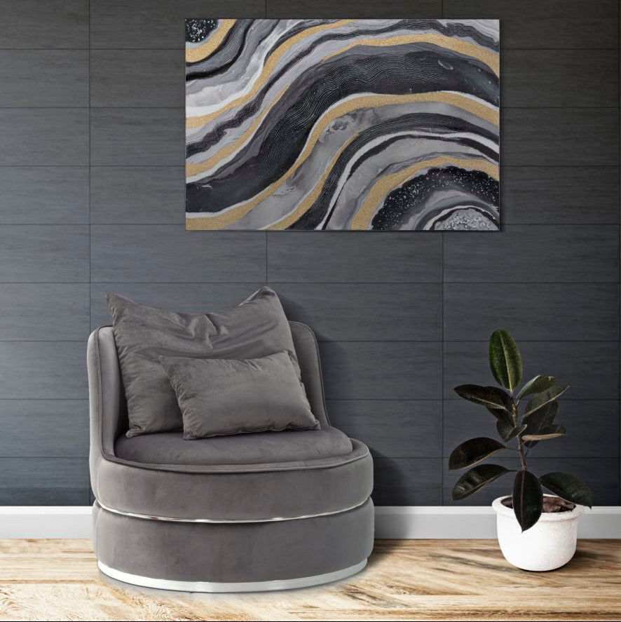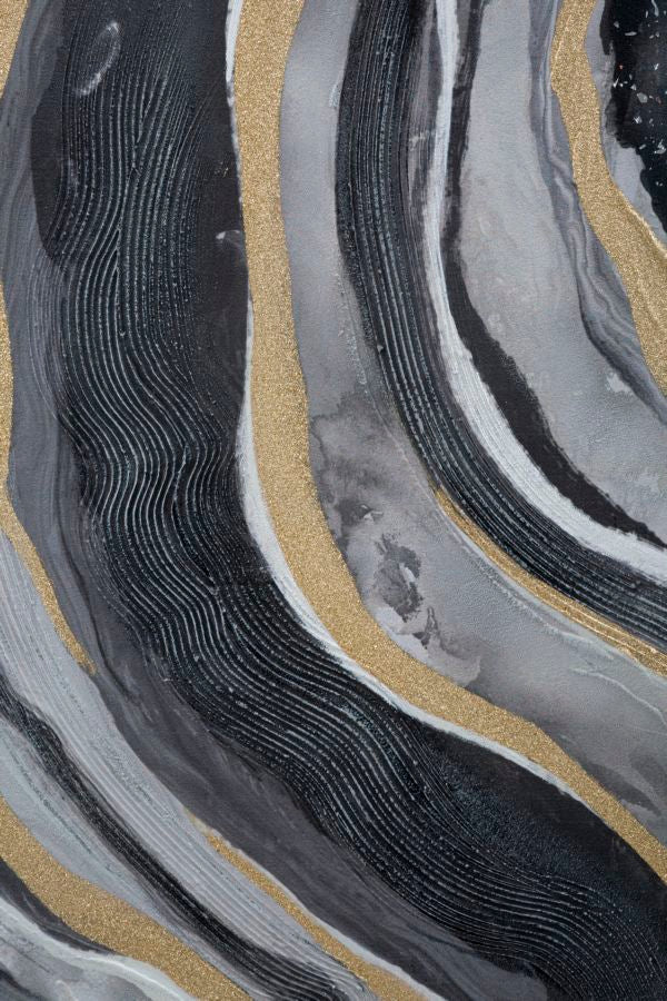 Un’opera moderna dal design elegante e sofisticato, caratterizzata da onde fluide nei toni del grigio e del nero, arricchite da dettagli dorati che donano luminosità e profondità alla composizione. Perfetto per ambienti contemporanei, questo dipinto si inserisce con armonia in salotti, studi e camere, diventando un punto focale che cattura lo sguardo.