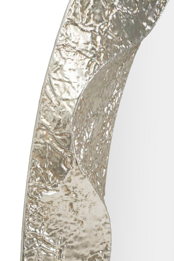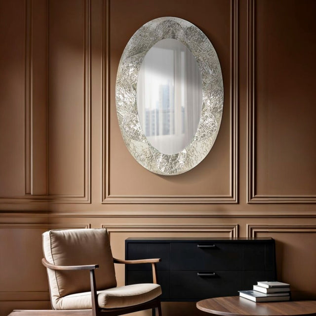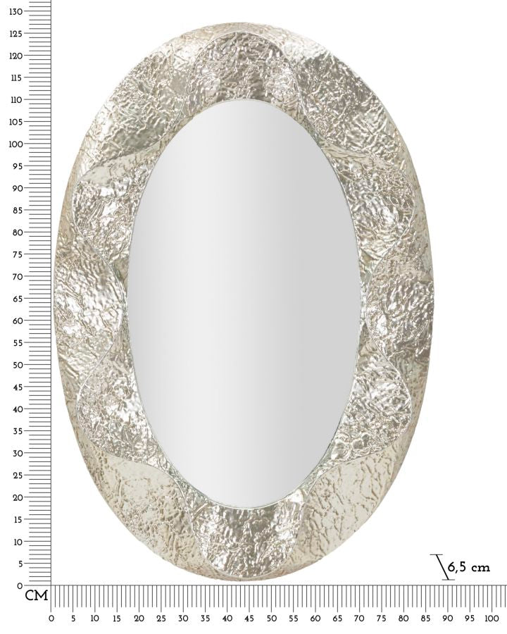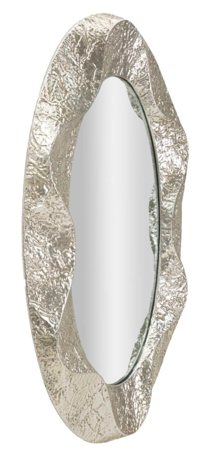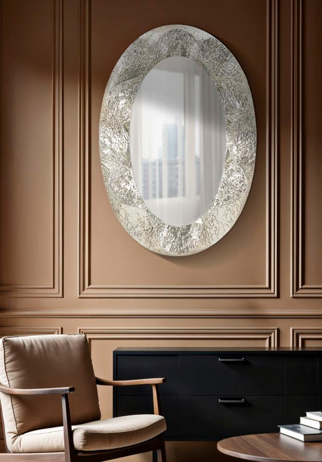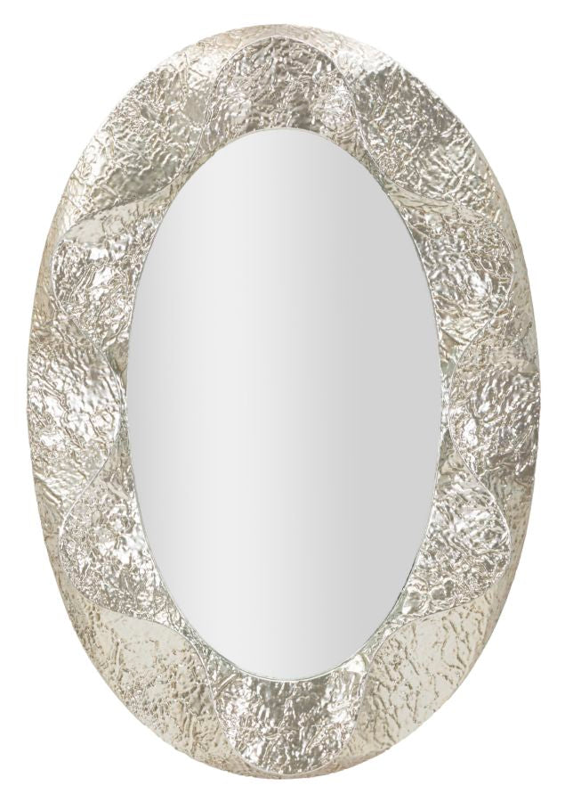 Specchio ovale con cornice elegante effetto martellato argento. Le sue forme morbide e la superficie ampia donano luce e raffinatezza a ingressi, camere o living dal gusto ricercato.