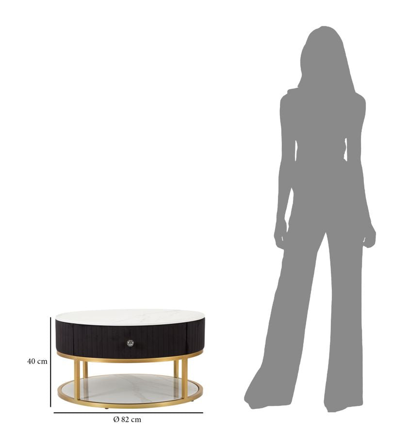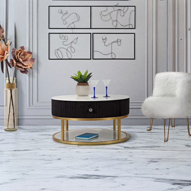 TAVOLO DA CAFFE' MONTPELLIER NERO - Tavolo da caffè rotondo con struttura in metallo dorato con top e ripiano in simil marmo e cassetto. La parte superiore è rivestita in tessuto imbottito nero. L'insieme crea un elegante contrasto che può essere abbinato a qualsiasi tipologia di arredo.