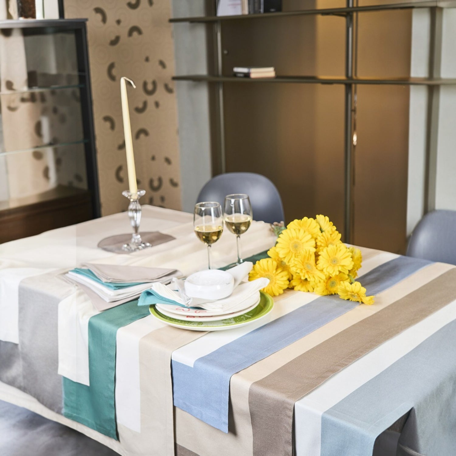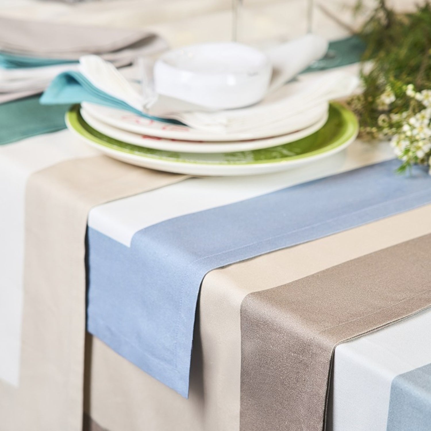 Tovaglia in panama 100% cotone stampa digitale piazzata con angolo a cappuccio e bordo a contrasto.