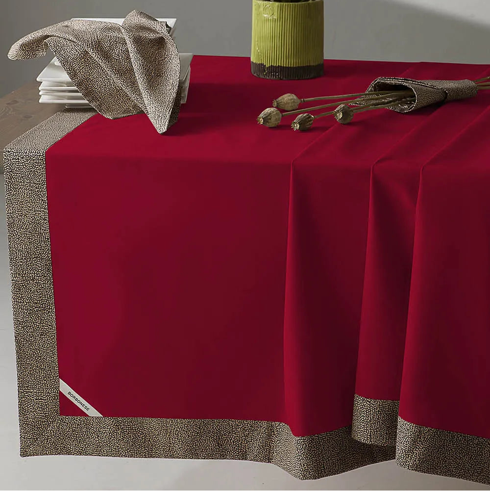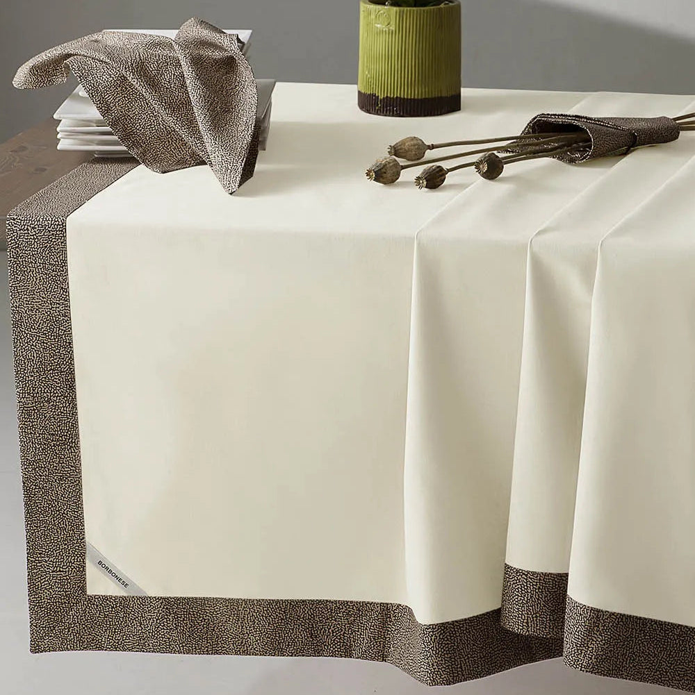 Servizio tavola in panama tinta unita 100% cotone con bordi applicati e tovaglioli stampati con design personalizzato dall’iconica texture “OP” Occhio di Pernice.Confezione tovaglia e tovaglioli con angolo a cappuccio. Vesti di eleganza la tua casa, con l’esperienza di Tessitura Randi e il design iconico Borbonese.