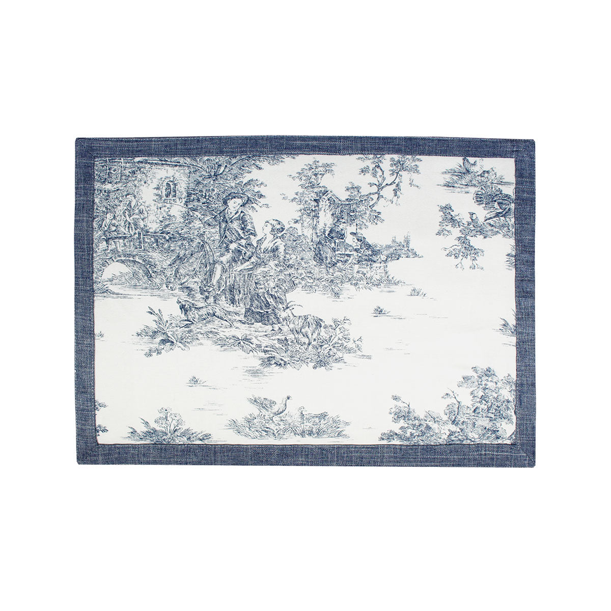 La tovaglietta Toile de Jouy blu richiama il fascino dello stile francese con il suo raffinato motivo campestre in delicata sfumatura di blu.