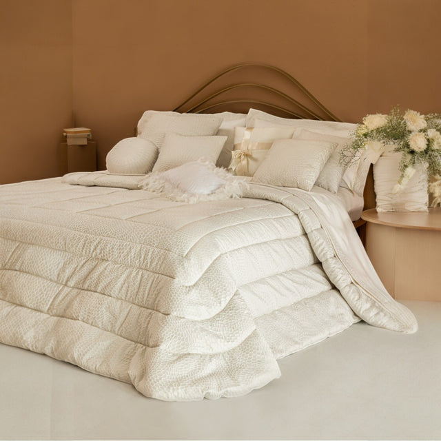 Trapunta 350gr in pregiato tessuto jacquard, disegno piazzato. Realizzata artigianalmente e 100% Made in Italy.