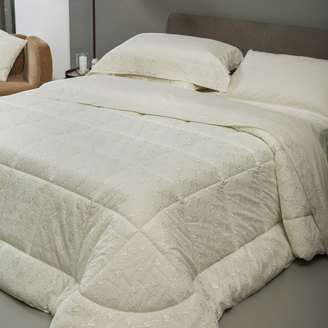 Trapunta in rasone color panna con prezioso tulle ricamato. Realizzata artigianalmente e 100% Made in Italy.