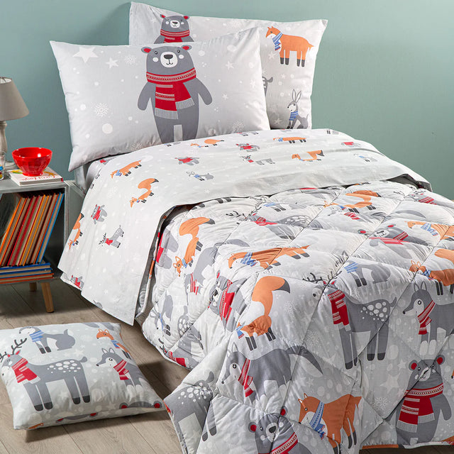 Trapunta Caleffi Teddy è pensata per regalare calore e comfort ai più piccoli, con una simpatica fantasia a tema orsetti e animali del bosco che indossano sciarpe colorate.