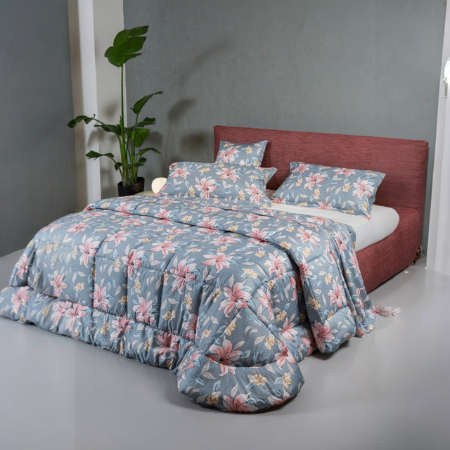 Trapunta in pregiato raso satin 100% 300 TC stampa digitale disegno floreale.