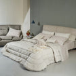 Trapunta 350gr in pregiato tessuto jacquard color beige, disegno piazzato. Realizzata artigianalmente e 100% Made in Italy.