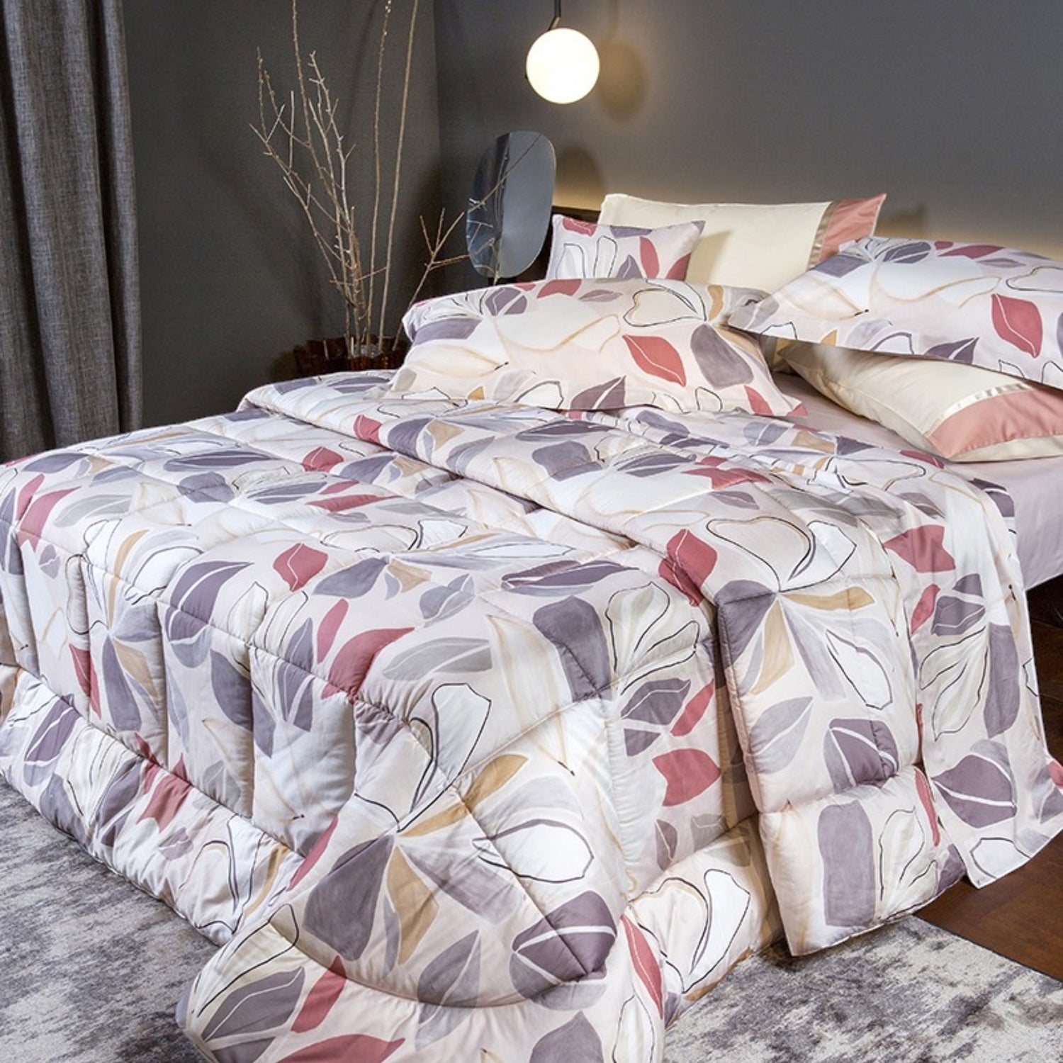 Trapunta in pregiato raso satin 100% cotone 300 TC stampa digitale con disegno floreale frutto di creatività e cura artigianale.